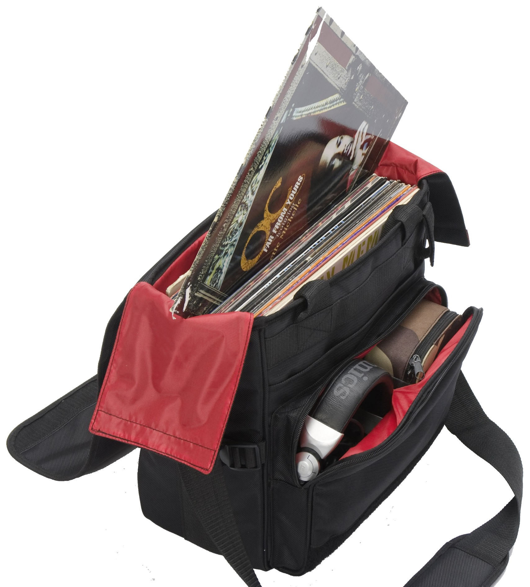 Le sac peut également accueillir un grand CD-Wallet ou des accessoires essentiels comme un casque DJ, un étui à cellules ou des aiguilles. Cette polyvalence en fait un sac pratique pour centraliser le matériel nécessaire à une prestation vinyle.