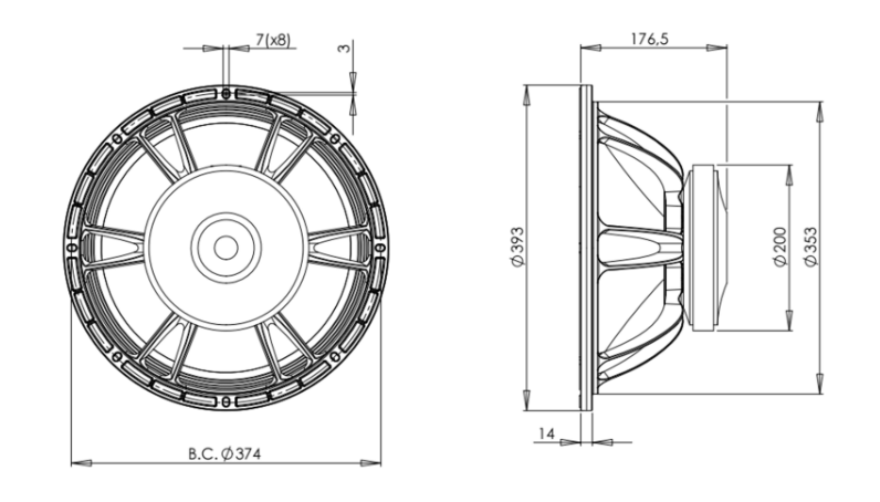 Le haut-parleur mesure 394 mm de diamètre total pour 353 mm d’encastrement. Sa profondeur est de 162,5 mm, ce qui permet une intégration dans la majorité des caissons 15 pouces.