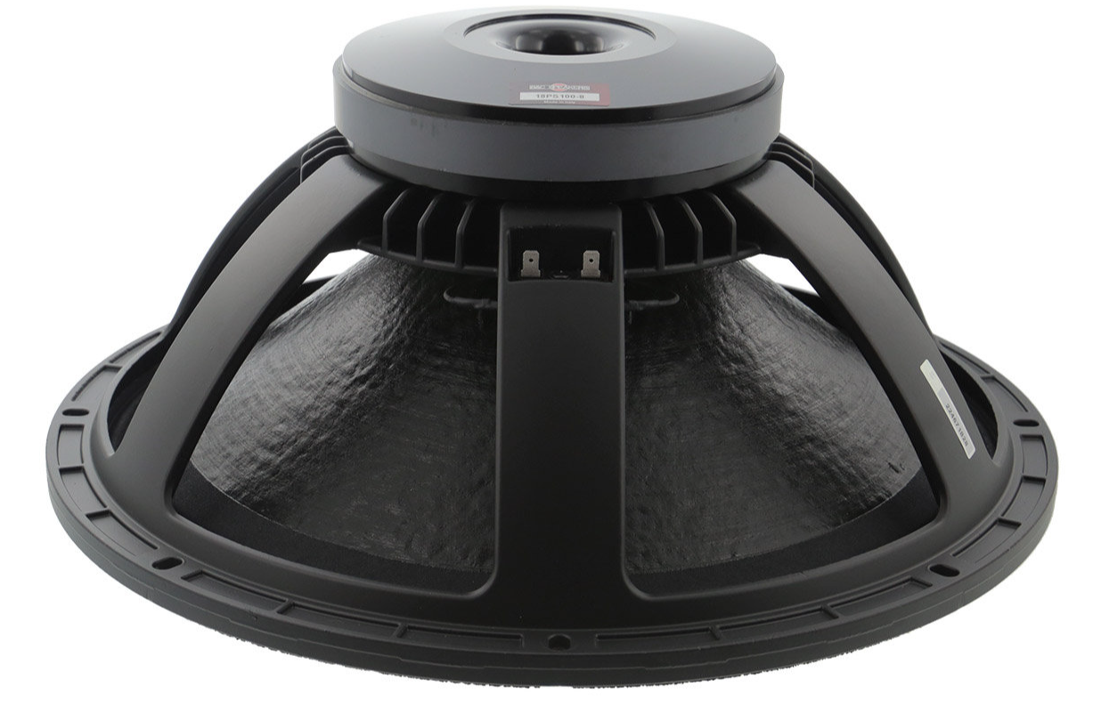 Ce comportement est renforcé par un double spider siliconé, qui assure un déplacement précis de la bobine. L’ensemble favorise un son propre même à fort niveau. Couplé à une charge bass-reflex de 250 litres accordée à 29 Hz, ce haut-parleur donne le meilleur de lui-même dans les applications sub-grave professionnelles.
