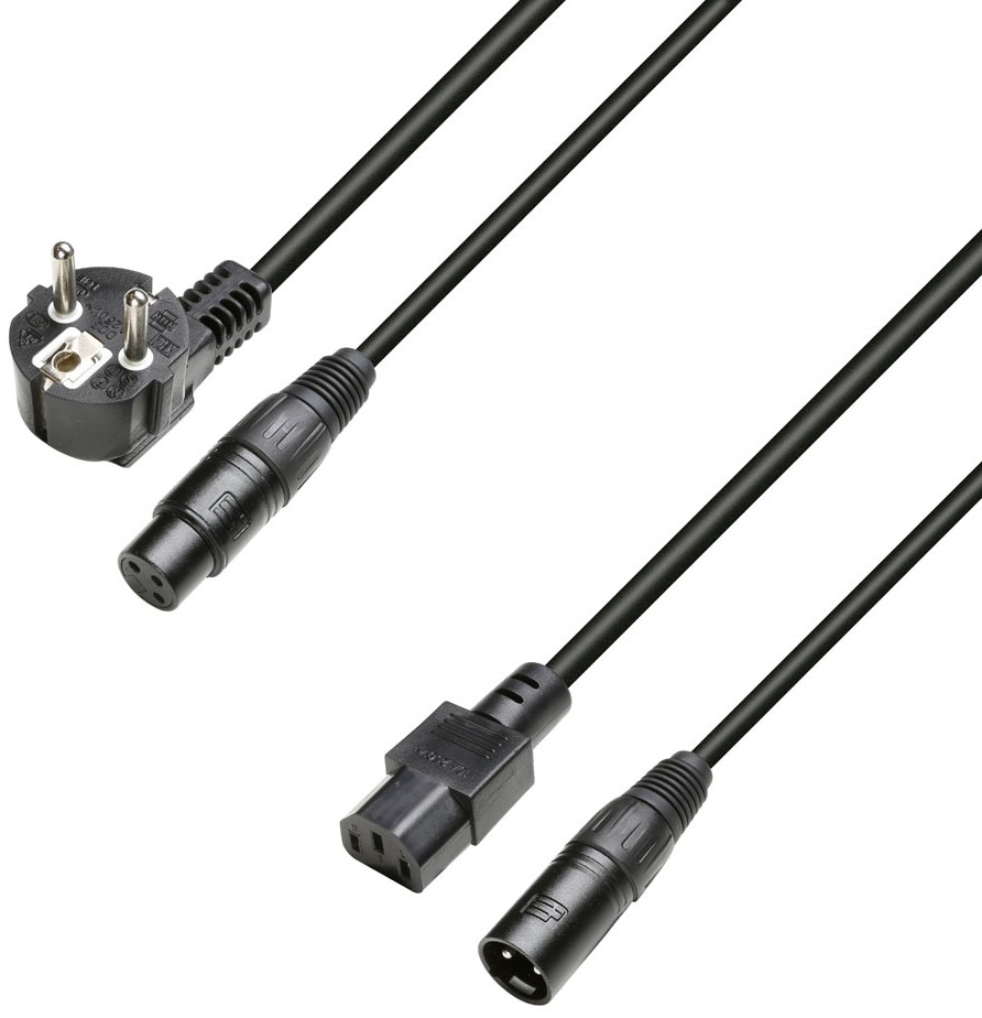 Le câble est équipé de connecteurs universels : XLR 3 broches mâle et femelle pour l’audio, IEC C13 femelle et Schuko mâle coudé pour l’alimentation. Cette combinaison permet une compatibilité étendue avec les équipements standards de sonorisation, d’éclairage ou de production audiovisuelle.