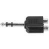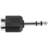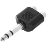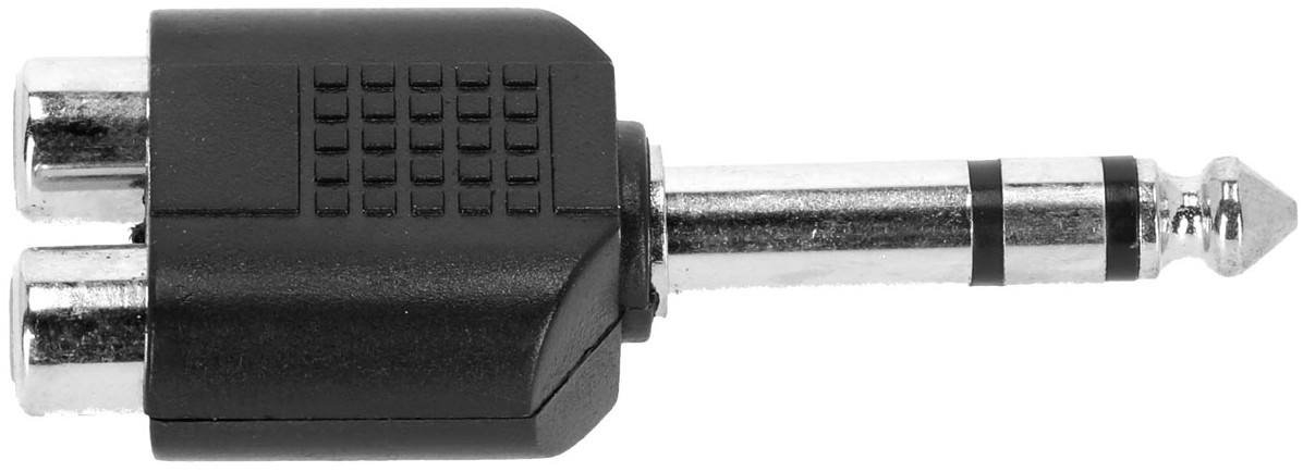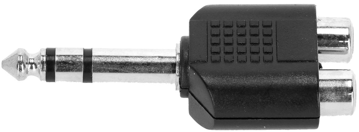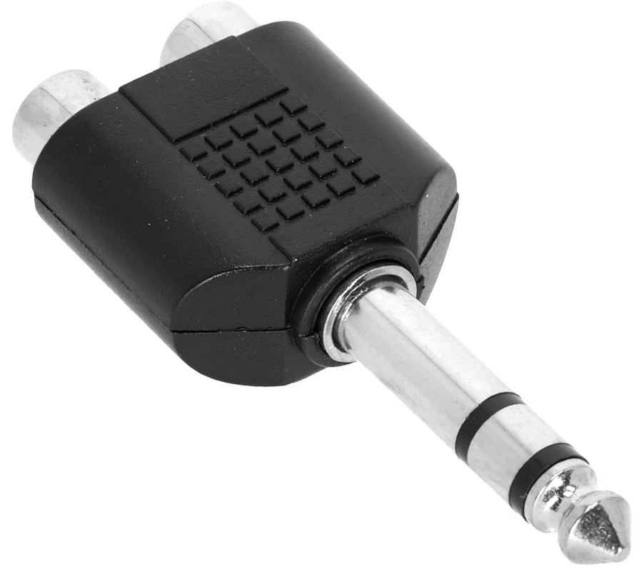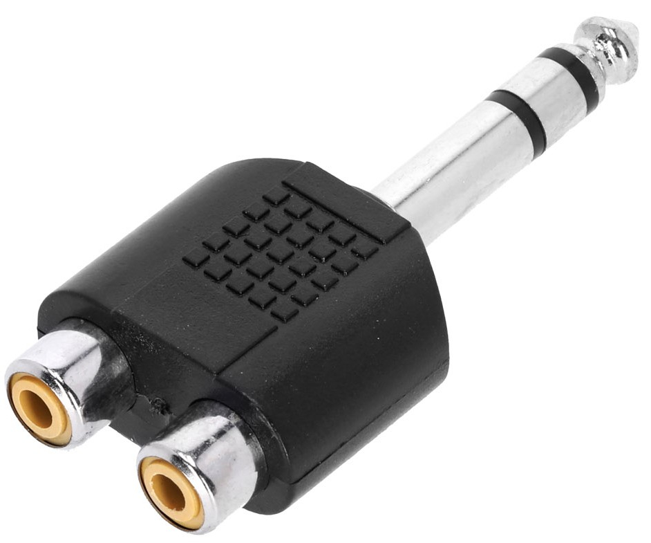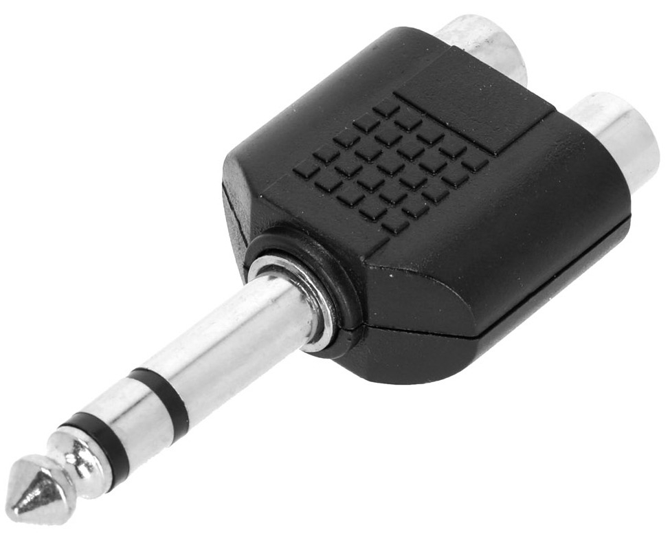 Cet adaptateur permet de connecter deux sources audio RCA femelles à une entrée jack 6,35 mm TRS mâle, utile pour centraliser un signal stéréo ou interfacer différents équipements audio comme un lecteur et une console.