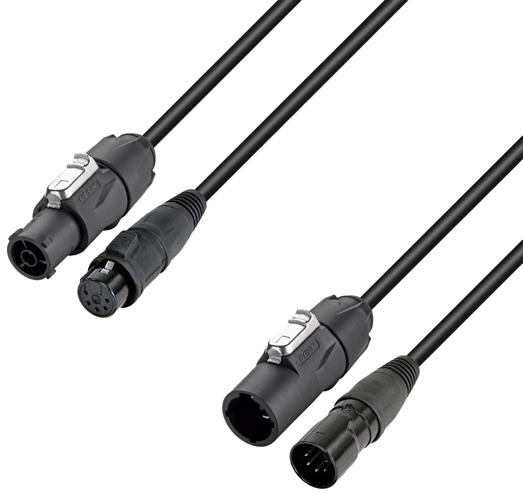 Le câble hybride transporte à la fois les signaux DMX (via un conducteur de 2 x 0,22 mm²) et la tension secteur (3 x 1,5 mm²), ce qui le rend très pratique pour les installations lumières tout-en-un.