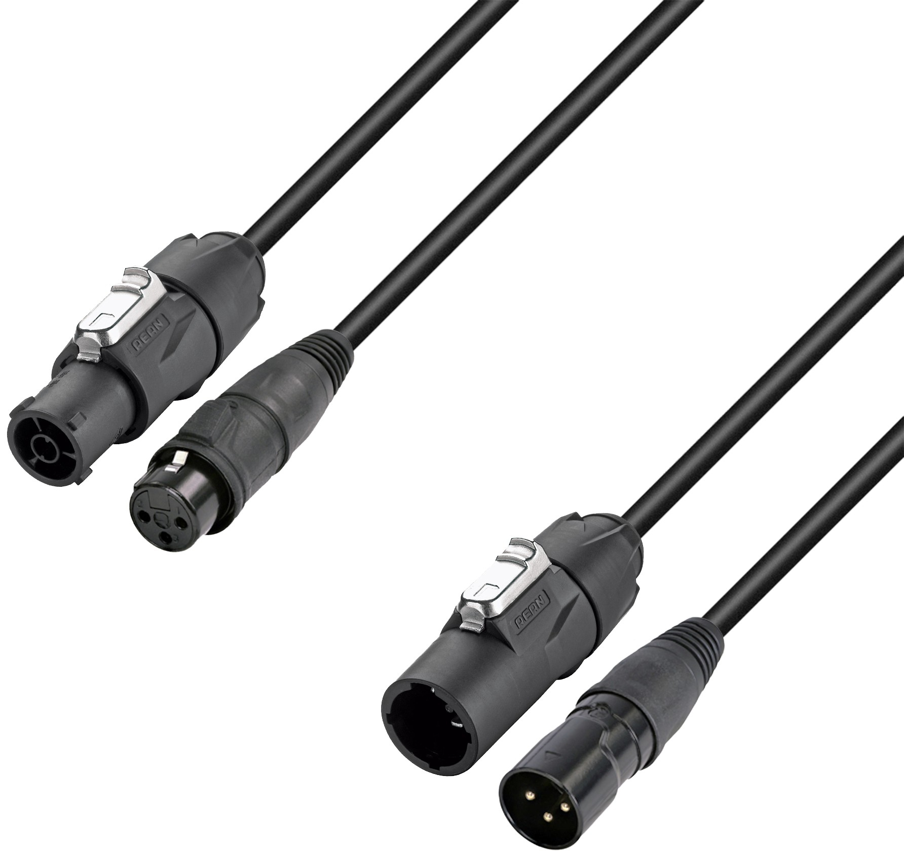 Le câble est équipé de connecteurs Rean® XLR 3 broches pour la transmission DMX, ainsi que de fiches secteur X-Series compatibles TRUE1®. Ces composants professionnels sont conçus pour supporter une utilisation intensive sur le terrain, tout en garantissant un branchement sécurisé même sous charge grâce à leur certification IP65.