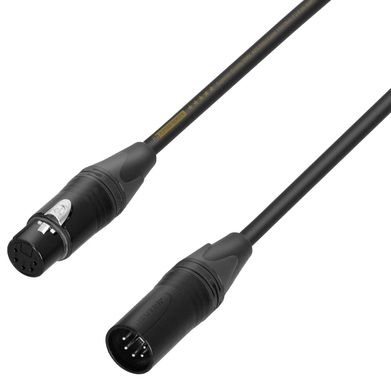 Un câble DMX équipé de connecteurs XLR 5 points Neutrik, comme le 5 STAR DGH 0300, permet de transmettre des signaux numériques DMX512 avec une grande précision. Ce format 5 pôles est particulièrement utile pour les installations qui nécessitent plusieurs univers DMX ou une ligne de secours.