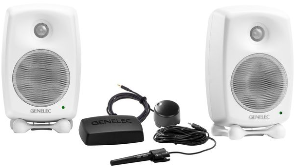 Le pack inclut : 2 enceintes Genelec 8320 AWM, un micro de mesure, une interface GLM, un support de micro, un câble USB, deux câbles RJ45, des câbles d’alimentation et un contrôleur de volume filaire Genelec 9310BM. L’ensemble est prêt à l’emploi pour une configuration studio.