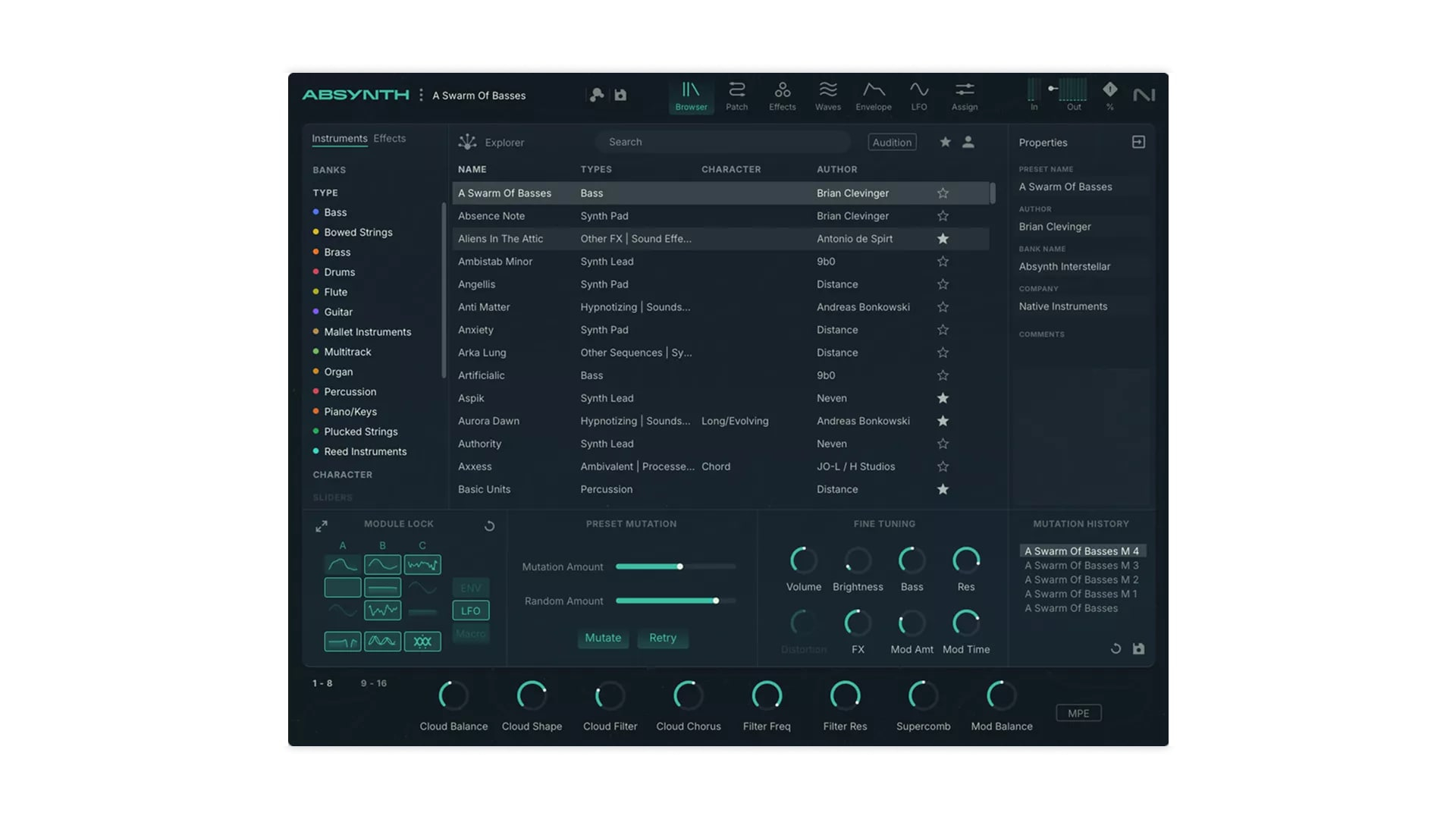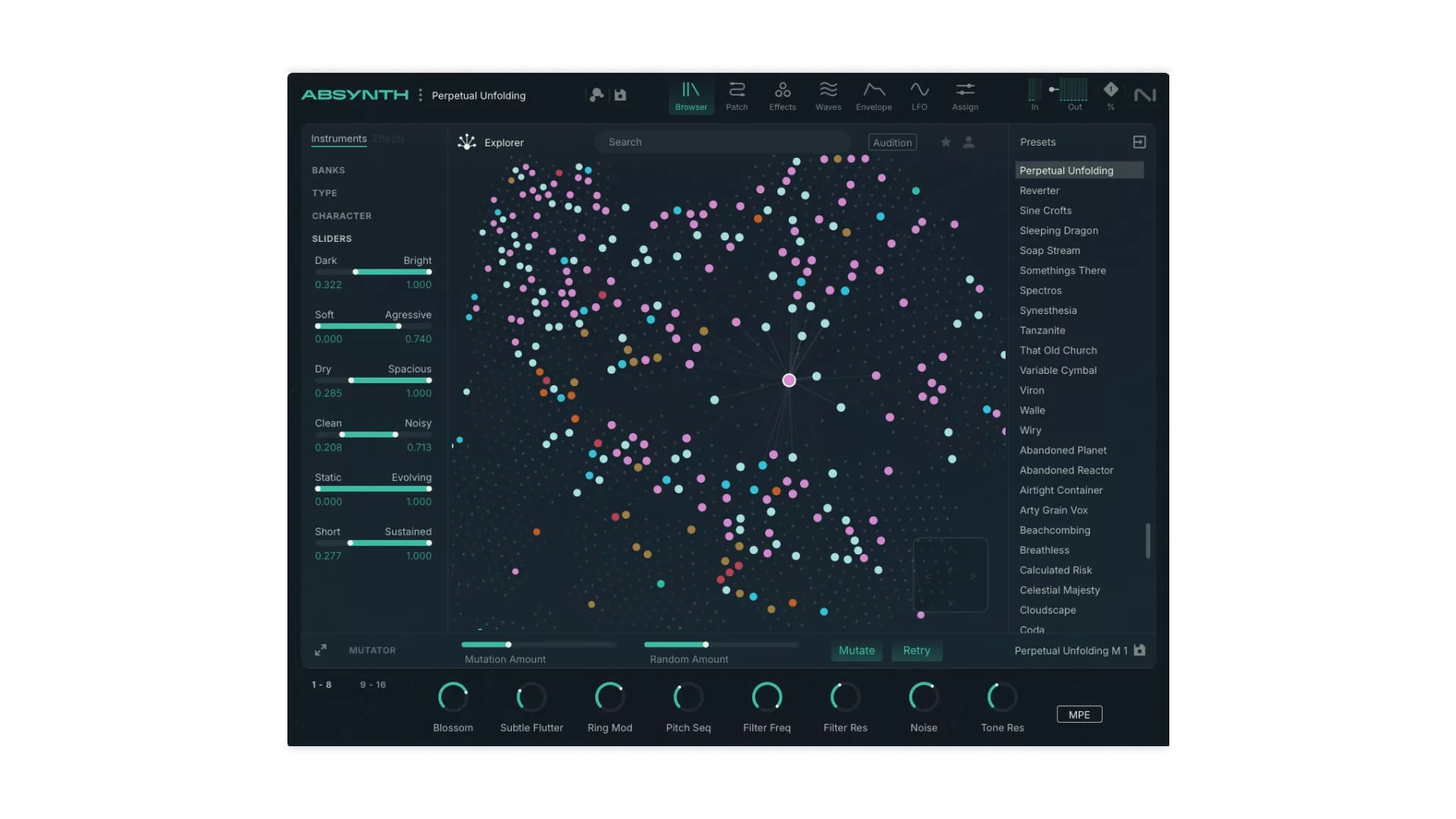 Le système de mutation (Mutator) permet de faire évoluer un patch de manière contrôlée en générant des variantes autour d’un son d’origine. Cette fonction est idéale pour générer de nouvelles textures rapidement tout en gardant une cohérence musicale. Le flux de travail devient ainsi plus intuitif et inspirant, en particulier dans les environnements de composition rapide ou live.