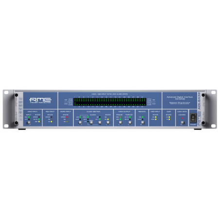 Le convertisseur RME ADI-6432 avec alimentation redondante offre 64 canaux audio de conversion MADI vers AES et vice versa. Il est identique au ADI-6432, mais peut être connecté à deux circuits électriques différents : si l'un de ces circuits tombe en panne, l'ADI-6432 R continuera à fonctionner sans interruption. Ses applications les plus typiques sont la création d'un multipaire numérique en utilisant deux convertisseurs ou en utilisation comme interface d'entrées/sorties AES/EBU avec une carte HDSP MADI. Il supporte des fréquences d'échantillonnage de 192 kHz sous 24-Bit de résolution. Assemblé dans un rack 2U, il dispose d'assez d'espace pour intégrer tous les éléments de contrôle et de connectique.