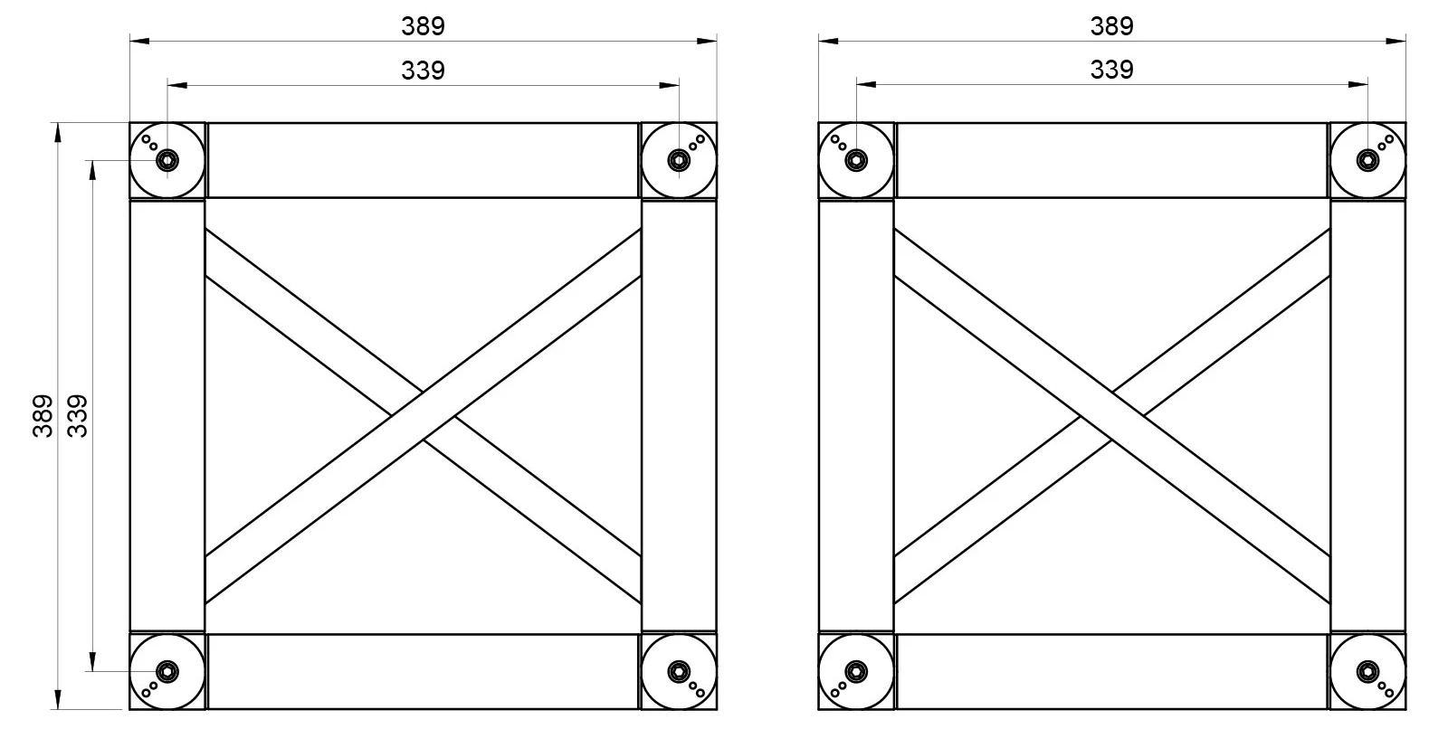 Son format de 390 x 390 x 390 mm correspond à l’encombrement annoncé pour cette catégorie de pièce de jonction. L’entraxe de 340 mm entre chaque tube et la compatibilité avec la structure carrée 390 assurent une continuité logique avec les éléments de la série. Cette cohérence technique favorise un montage structuré, lisible et adapté aux besoins des professionnels de l’événementiel.