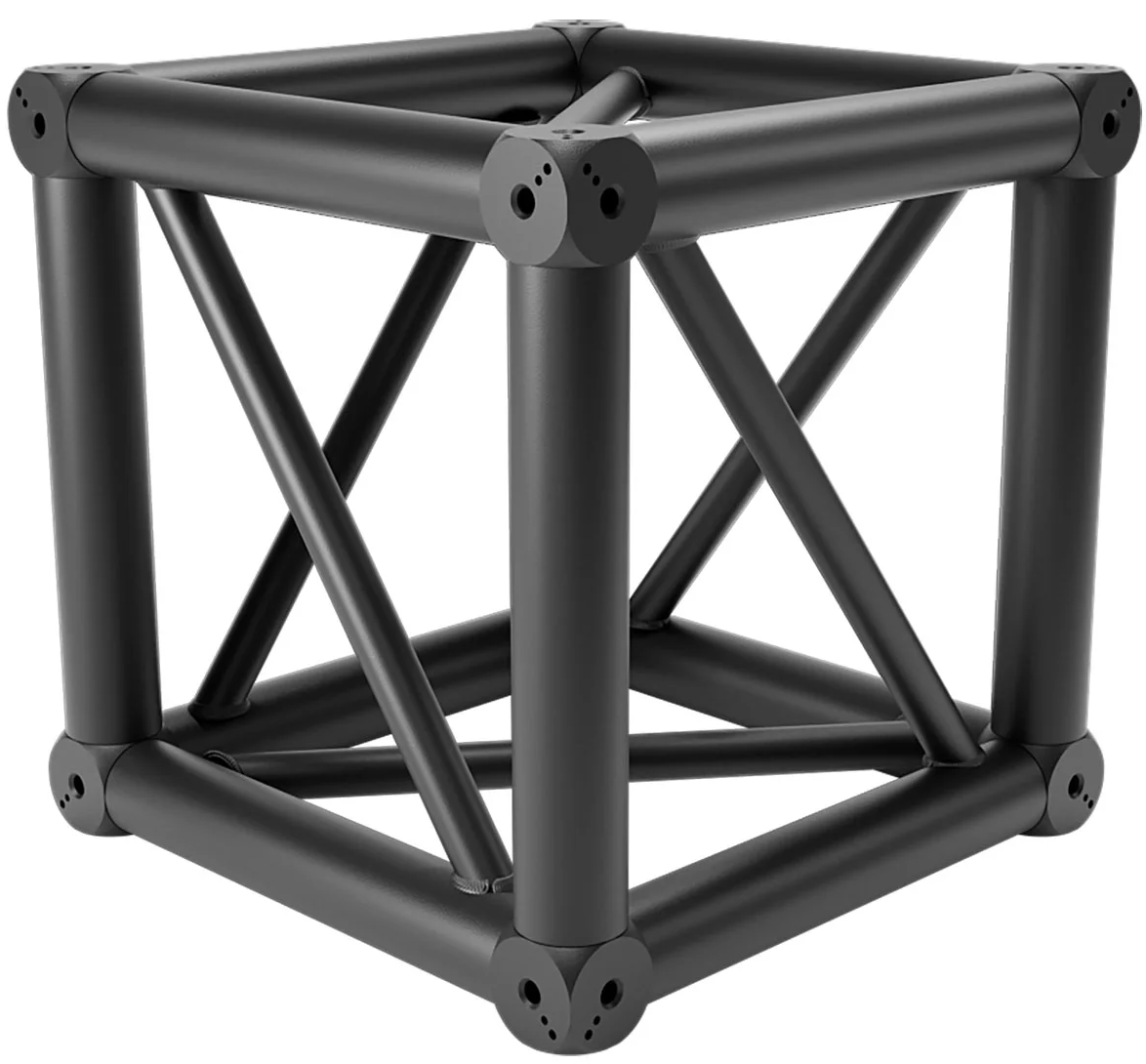 Grâce à son angle de jonction de 90°, ce cube de jonction simplifie la création de volumes réguliers et de connexions multidirectionnelles. Il peut être utilisé en montage horizontal ou vertical, selon la structure recherchée. Cette polyvalence facilite la mise en œuvre de toits de scène multi-niveaux et d’ensembles tridimensionnels cohérents dans le respect de la géométrie de la gamme QUATRO39.