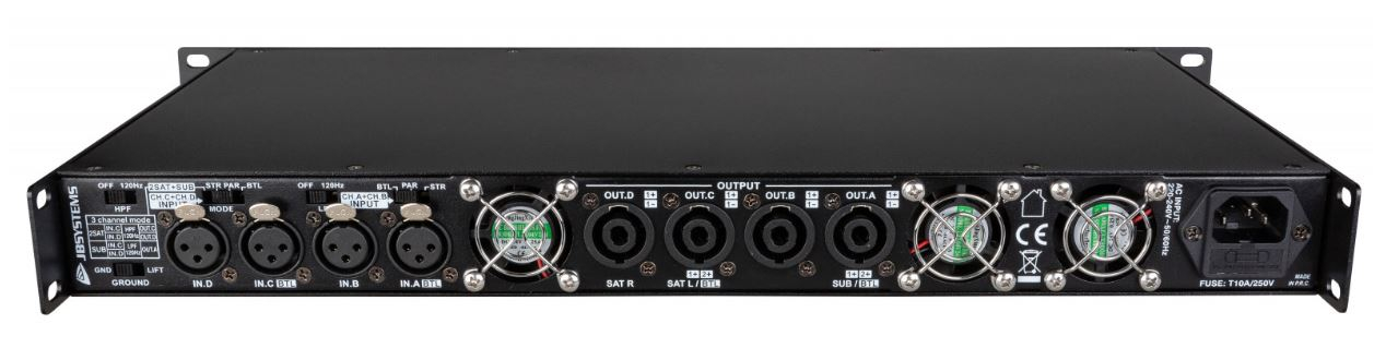 Mode 3 canaux (2 satellites + sub) : 2 x 200 W rms @ 4 Ω (ou 2 x 100 W rms @ 8 Ω) + 1 x 400 W rms @ 8 Ω
