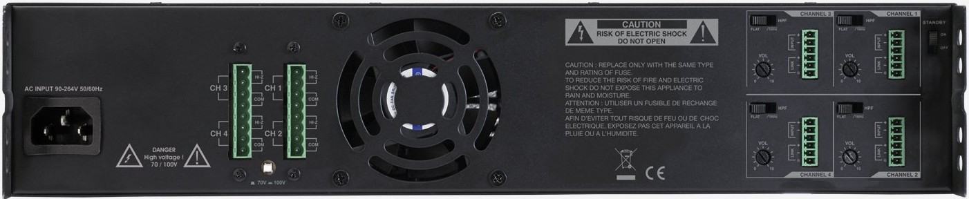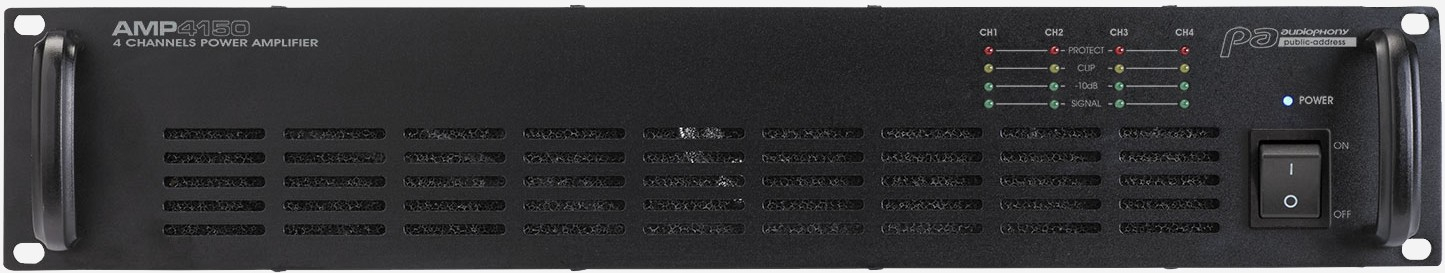 L’Audiophony AMP4150 délivre 4 canaux de 150 W sous 100 V. Cette puissance est idéale pour les systèmes de diffusion longue distance, notamment en lignes haute impédance pour installations fixes professionnelles.