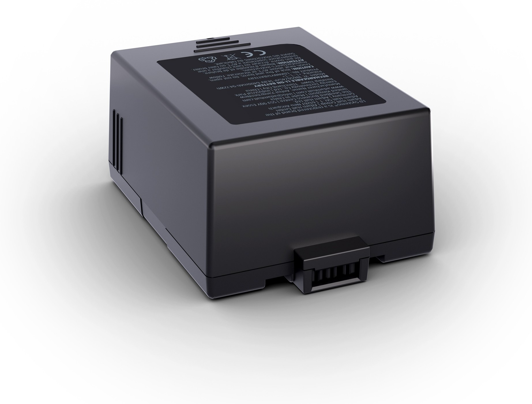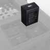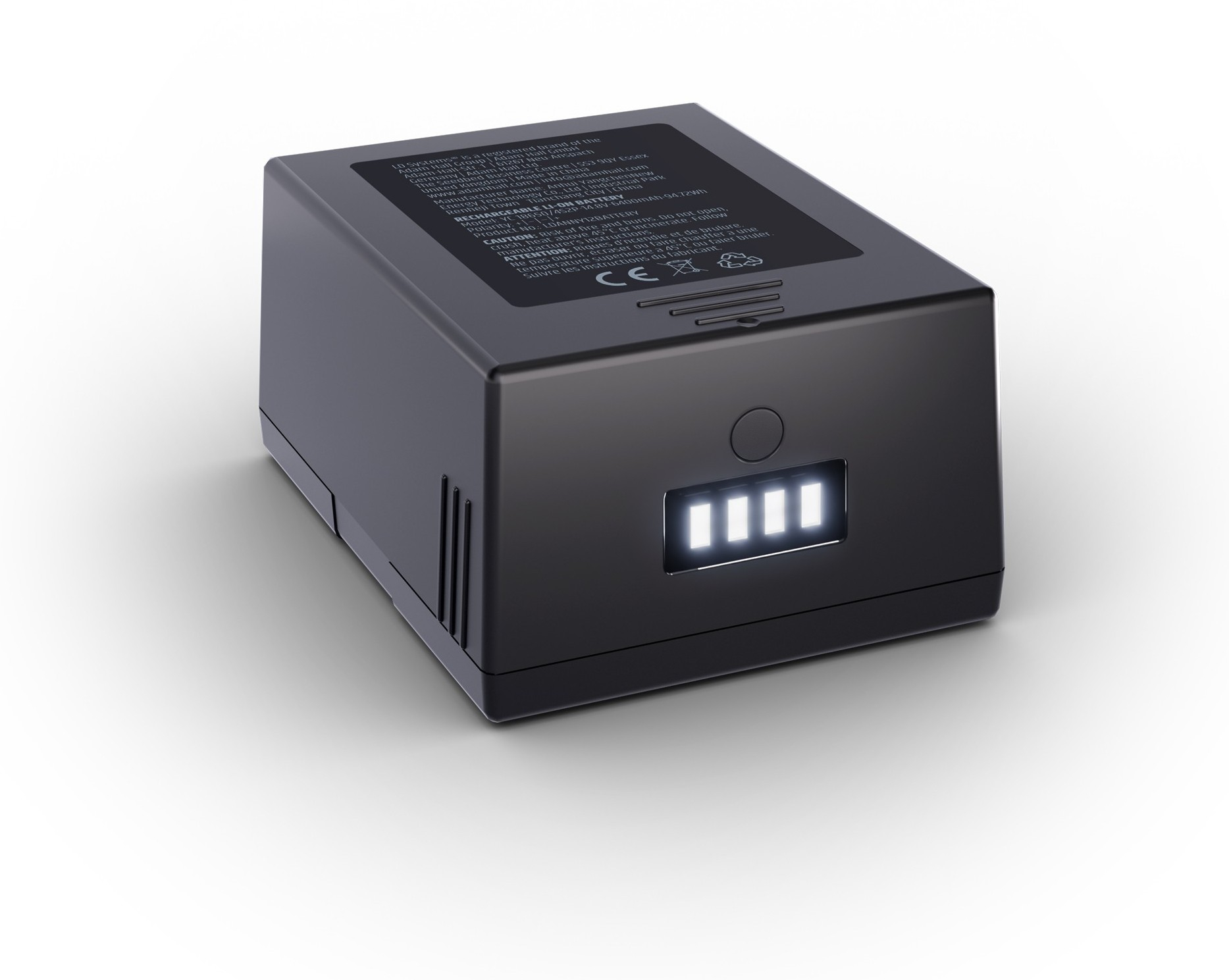 Le boîtier en plastique noir et les dimensions de 74 mm x 47 mm x 100 mm facilitent l’identification physique du produit dans un environnement où plusieurs accessoires peuvent coexister. Le poids de 450 g reste également un point pratique pour le transport de batteries de rechange dans une housse, un flight-case ou un kit d’exploitation mobile. Cette intégration matérielle s’accompagne d’un affichage d’état à 4 LED visible depuis l’extérieur de l’enceinte, ce qui simplifie la vérification sans devoir interrompre l’installation ou retirer immédiatement la batterie.