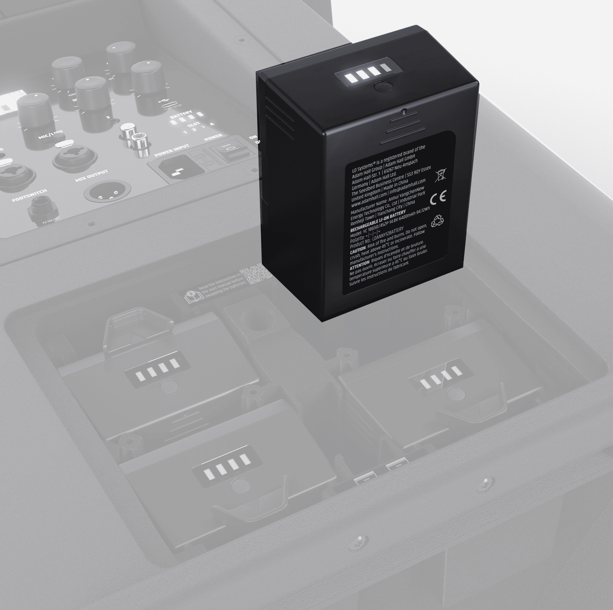 L’intérêt pratique de cette batterie supplémentaire LD Systems repose aussi sur sa compatibilité avec la fonction hot-swap de l’ANNY® 12. Une batterie déchargée peut être remplacée en quelques secondes par une batterie chargée, même pendant que l’appareil est en marche. Tant qu’au moins une batterie est insérée, l’ANNY® 12 continue de fonctionner à pleine puissance. Cette logique de remplacement rapide simplifie la gestion de l’autonomie et limite les interruptions pendant l’utilisation de l’enceinte.