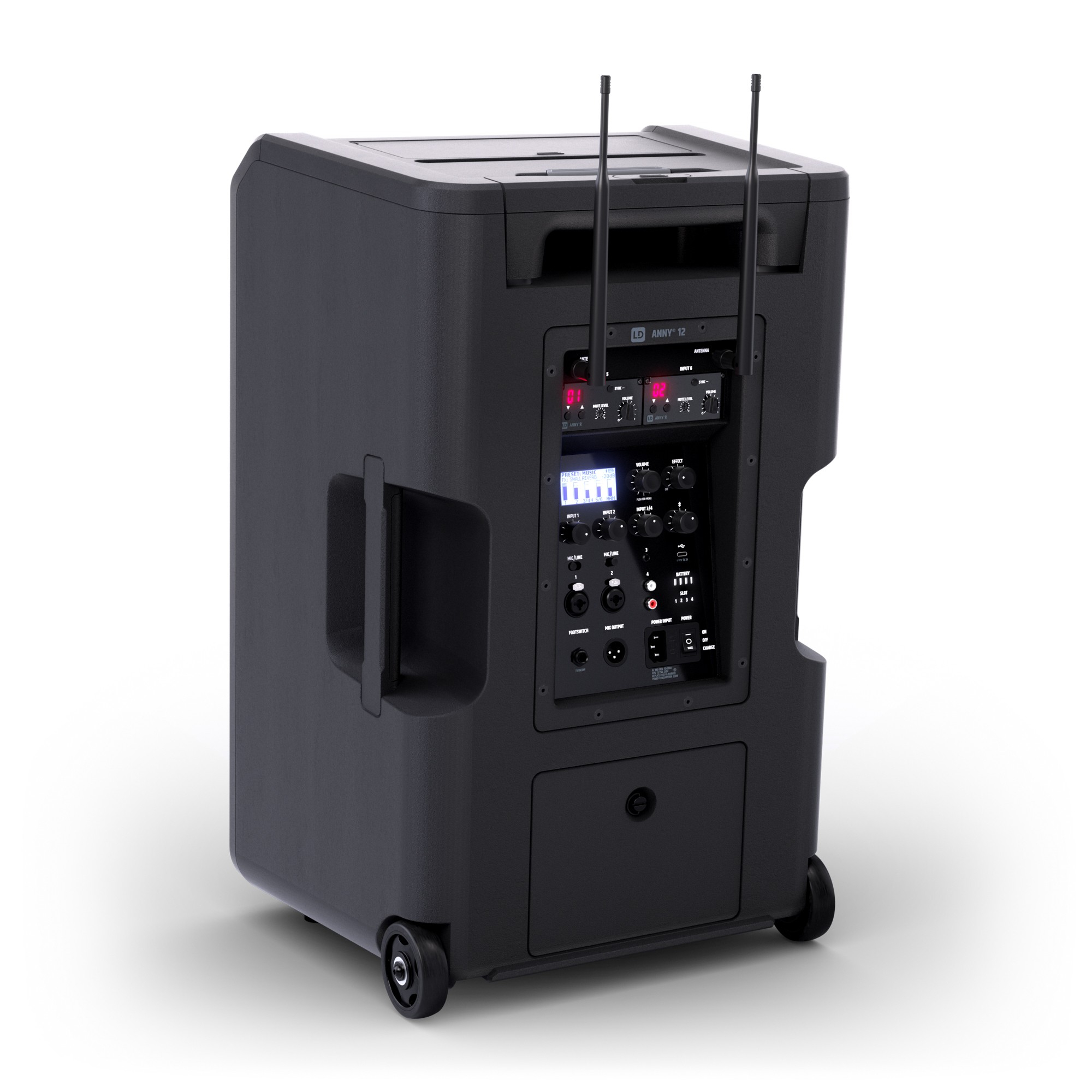 Le pack ANNY 12 HBH2 B6 comprend deux microphones sans fil opérationnels dès l'installation : un microphone à main cardioïde de 250,4 mm et un micro-casque cardioïde à condensateur avec émetteur de poche. Les deux appareils fonctionnent sur la bande 655 – 679 MHz avec 12 canaux sélectionnables et une puissance d'émission de 10 mW. La synchronisation de fréquence par infrarouge du micro à main simplifie l'appairage. Les modules récepteurs sont logés dans des emplacements dédiés à l'arrière de l'enceinte, avec un réglage de volume indépendant par canal. Deux emplacements supplémentaires permettent d'accueillir des récepteurs additionnels de la gamme ANNY pour étendre la configuration.