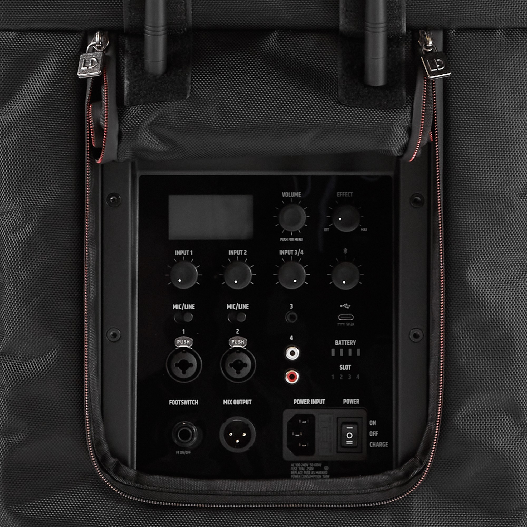 La différence principale mise en avant par la fiche tient à l’ouverture frontale enroulable, qui permet d’utiliser l’enceinte ANNY 12 sans retirer la housse. Une housse dépourvue de cet accès impose généralement de découvrir davantage l’enceinte pour conserver l’usage. Ici, la protection reste en place pendant que l’enceinte demeure exploitable. La LD Systems ANNY 12 PC ajoute aussi des trappes d’accès pour la poignée télescopique, les poignées de transport, le panneau de commande, les antennes et les connecteurs. Pour un usage mobile, cette conception favorise une manipulation plus directe, avec moins d’interruptions entre protection, transport, branchement et utilisation.