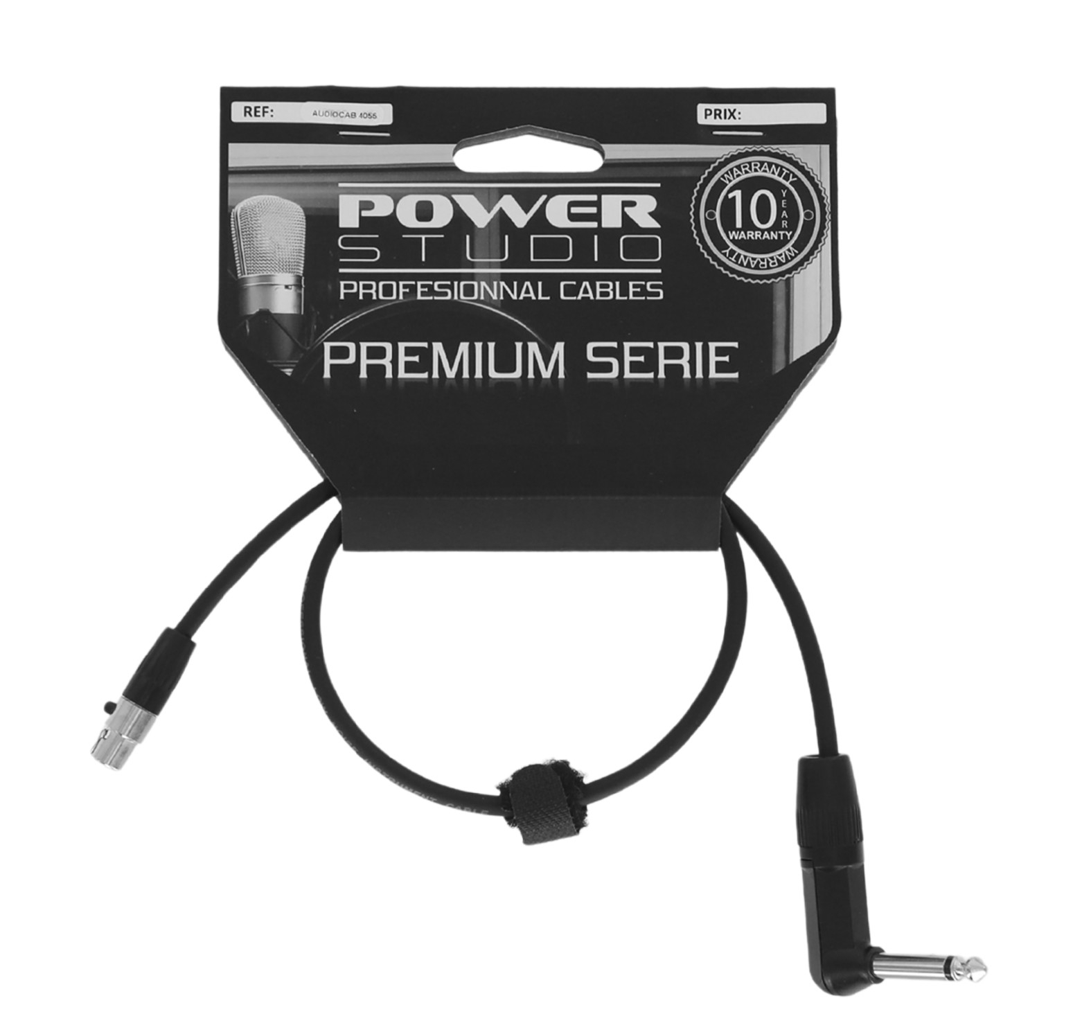 Le Power Studio AUDIOCAB 4055 repose sur une connectique précise, conçue pour établir une liaison entre une guitare et un Pocket sans fil. D’un côté, il intègre un Mini XLR femelle 4 broches de type Shure. De l’autre, il utilise un jack 6,35 mm TS mono coudé. Cette combinaison répond à un besoin de compatibilité clair dans une chaîne audio instrumentale courte, avec un format de branchement adapté aux équipements portables et aux accessoires de captation ou de transmission associés.