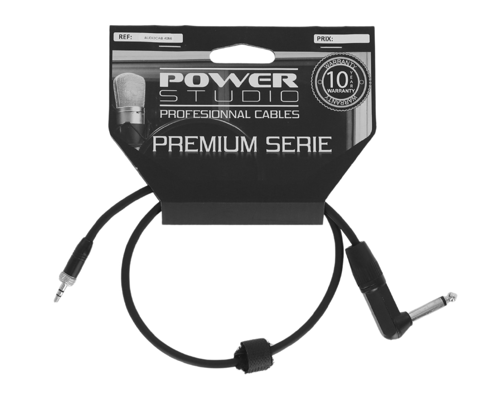 La différence tient d’abord à la spécialisation de la connectique. Le Power Studio AUDIOCAB 4056 combine un Mini Jack 3,5 mm TRS de type Sennheiser avec un Jack 6,35 mm TS mono coudé, alors qu’un câble générique peut proposer des prises droites ou des formats moins ciblés. La sortie coudée apporte un intérêt pratique lorsque l’espace autour de l’instrument est limité. Son autre particularité est sa longueur de 0,6 m, pensée pour une liaison courte. En contrepartie, un modèle plus générique pourra parfois convenir à davantage d’usages, mais avec moins de précision sur le cas guitare et pocket sans fil.