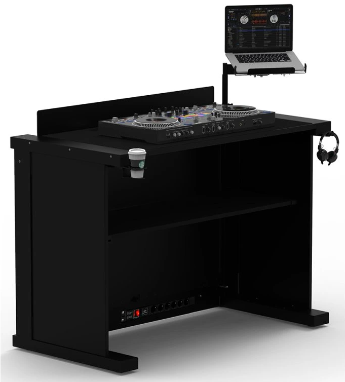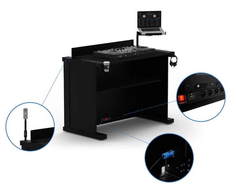 Le B3 mk2 est conçu pour s’adapter à toutes les configurations. Il intègre d’origine un support casque et un porte-gobelet, discrets et rétractables. Il accepte tous les types de contrôleurs, platines ou médias. Les accessoires comme les supports média, tablettes ou laptop se fixent à différents endroits pour un agencement optimal. Les étagères latérales offrent un espace pour enceintes, projecteurs ou objets personnels.