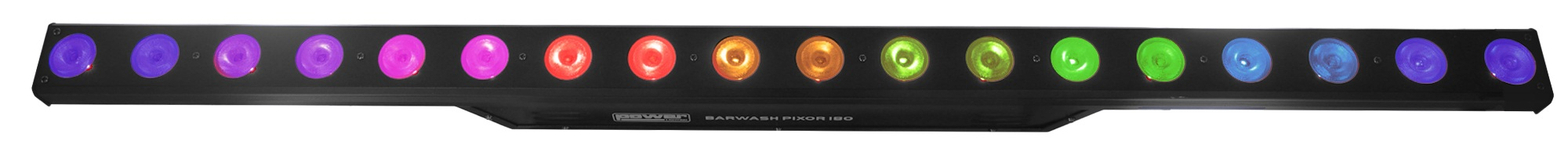 La BARWASH PIXOR 180 est équipée de 18 LEDs RGBW de 8 W, offrant une puissance lumineuse élevée, des couleurs riches et un rendu homogène. Ce type de LED permet un mélange de couleurs très précis, idéal pour des applications scéniques, événementielles et artistiques.