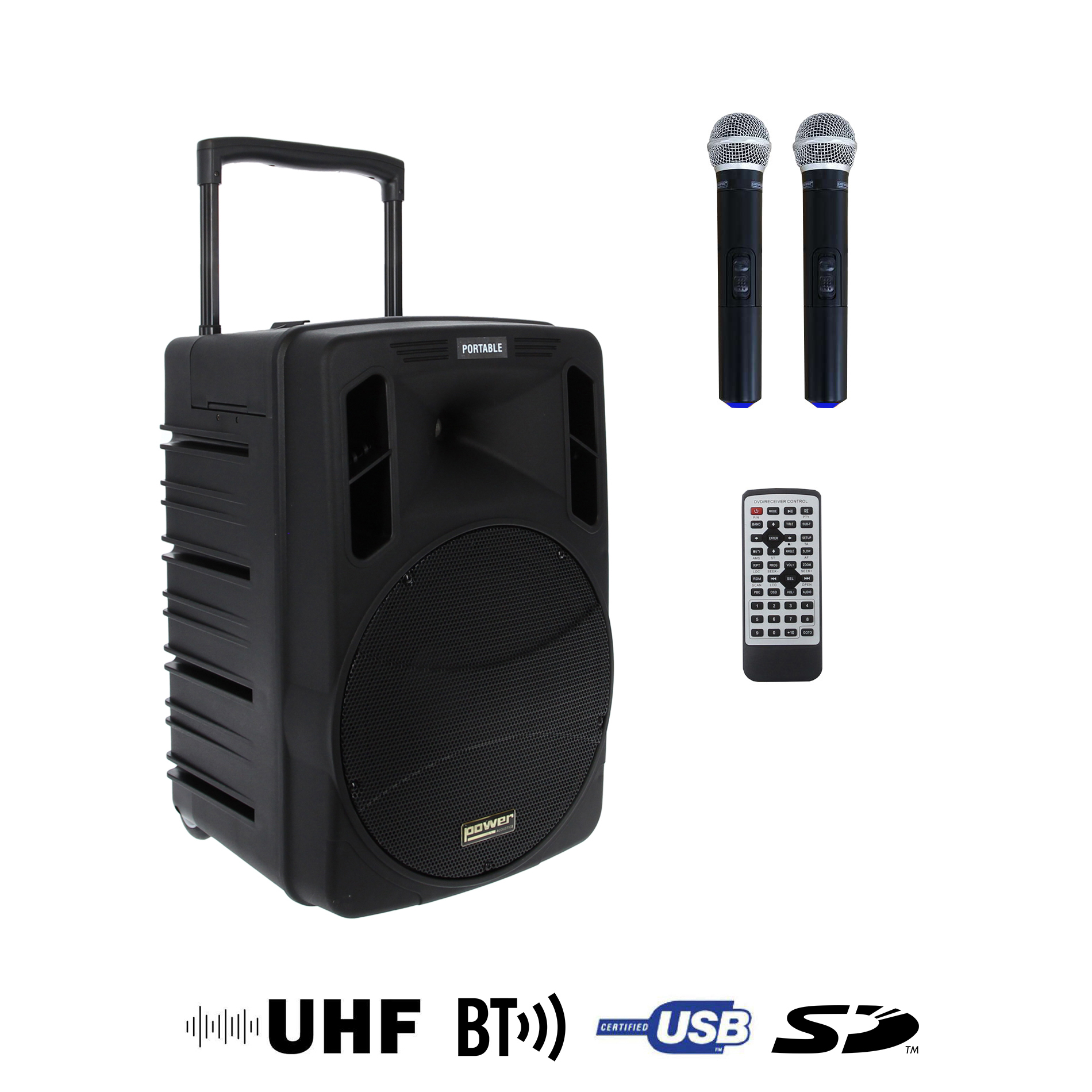 Le BE 9412 CD G2 inclut aussi deux récepteurs HF UHF et deux micros HF main, avec une option de serre-têtes indiquée si besoin. Le rangement intégré avec couvercle pour deux micros main est un détail d’usage utile pour protéger et transporter les accessoires fournis. En réunissant lecteur multimédia, connectique RCA, entrée USB, Bluetooth et micros UHF dans un même châssis, Power Acoustics propose un système cohérent pour les utilisateurs qui recherchent une solution de sonorisation portable prête à l’emploi.