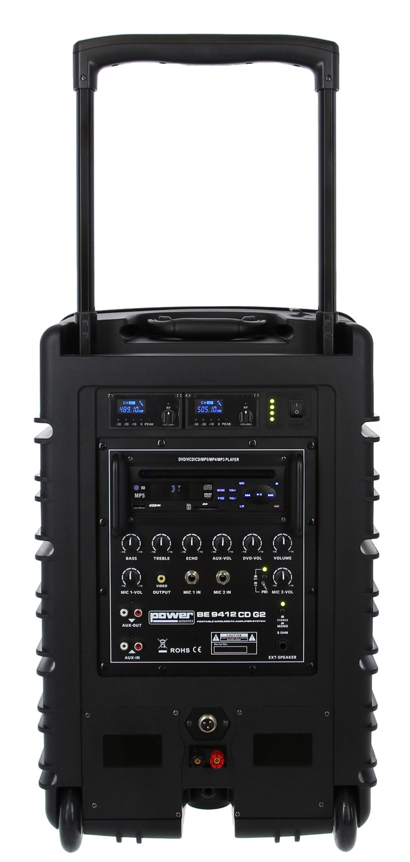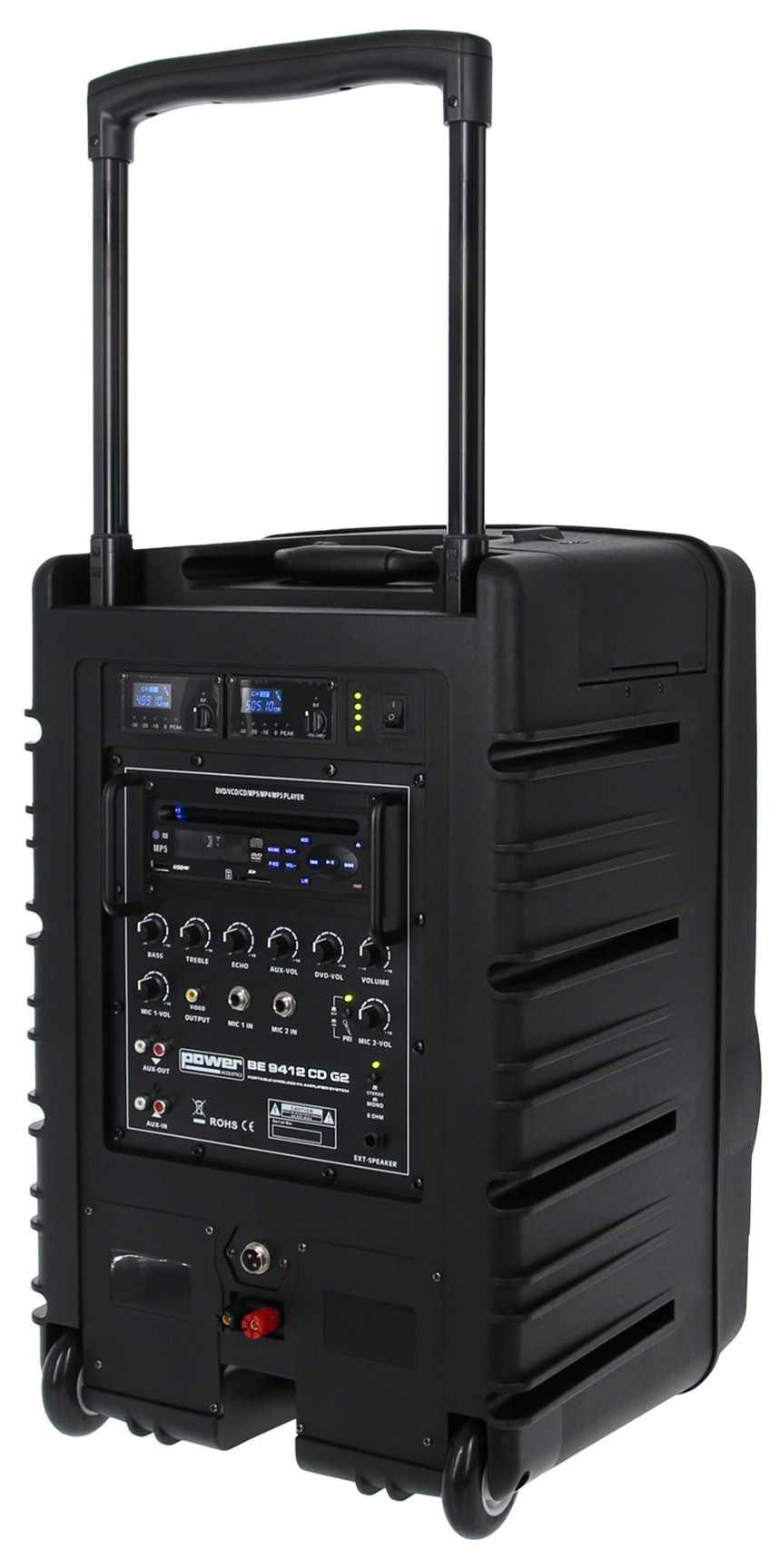 La différence principale tient à l’équipement intégré. La BE 9412 CD G2 Power Acoustics inclut deux récepteurs HF UHF et deux micros main, ce qui permet de démarrer une prestation de conférence ou de discours sans ajouter immédiatement un système sans fil externe. Les micros multi-fréquences sont présentés comme offrant une meilleure stabilité de transmission et une plus grande flexibilité d’utilisation. En plus des micros, le produit réunit Bluetooth, USB, lecteur SD/DVD/DivX/CD MP3 et connectique AUX. Cette combinaison limite le nombre d’appareils à transporter et simplifie l’organisation d’une sonorisation mobile.