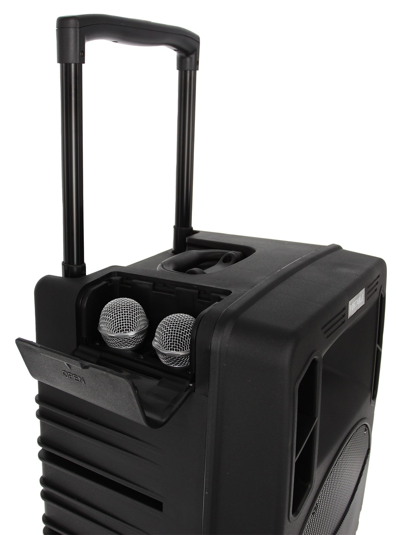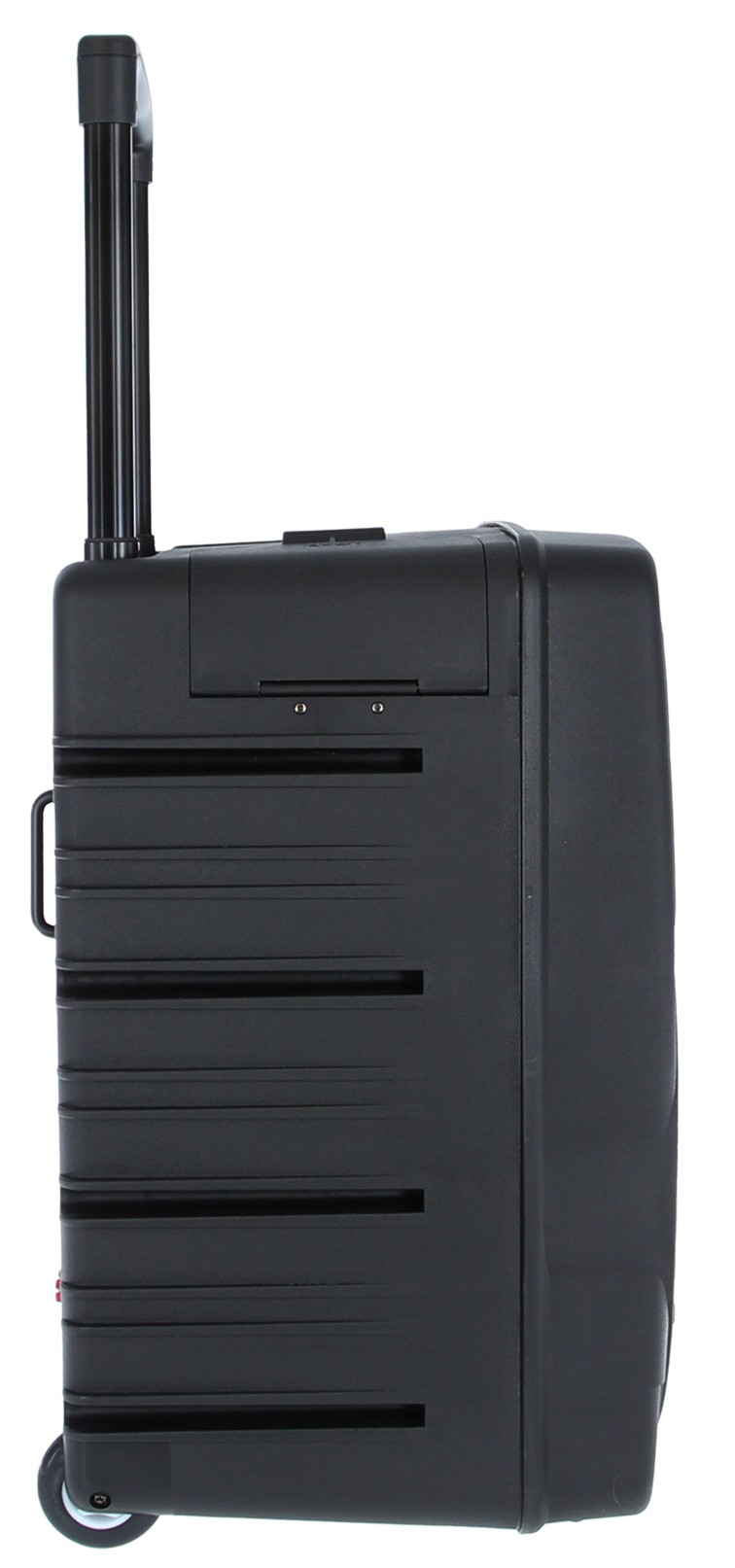 Pour la prise de parole, les deux micros HF mains permettent de gérer un intervenant principal et un second participant. Les deux entrées micro filaires en jack 6,35 mm peuvent aussi compléter l’installation selon le besoin. Le rangement dédié pour deux micros main, le trolley rétractable et les poignées latérales facilitent le transport et l’organisation entre deux interventions. Cette logique de conception répond à un usage itinérant où la rapidité de mise en place et le rangement des accessoires sont des points importants.