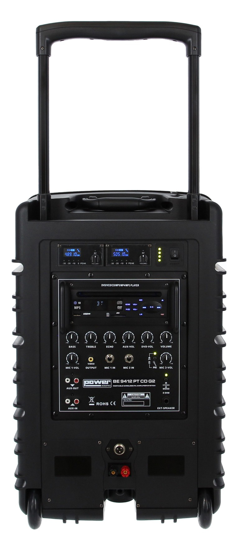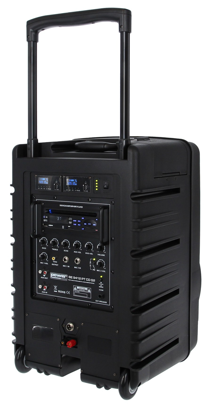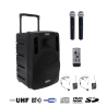 Le Power Acoustics BE 9412 PT CD G2 est une sono portable lecteur CD MP3/SD/USB/DivX/Bluetooth + 2 micros main et 2 serre-tête UHF. Cette génération adopte un design modernisé et des micros multi-fréquences pour améliorer la stabilité de transmission et la flexibilité d’utilisation. Sa puissance de 250 W, sa batterie rechargeable 12 V / 12 Ah et son format compact permettent de sonoriser des conférences, discours et présentations. Elle intègre un lecteur CD MP3, DVD, DivX, une entrée USB, un récepteur Bluetooth, deux récepteurs HF UHF, des entrées micro filaires et des connexions auxiliaires RCA. Le trolley rétractable, les poignées latérales et la finition ABS facilitent le transport. Les micros serre-tête ne fonctionnent pas simultanément avec les micros main.