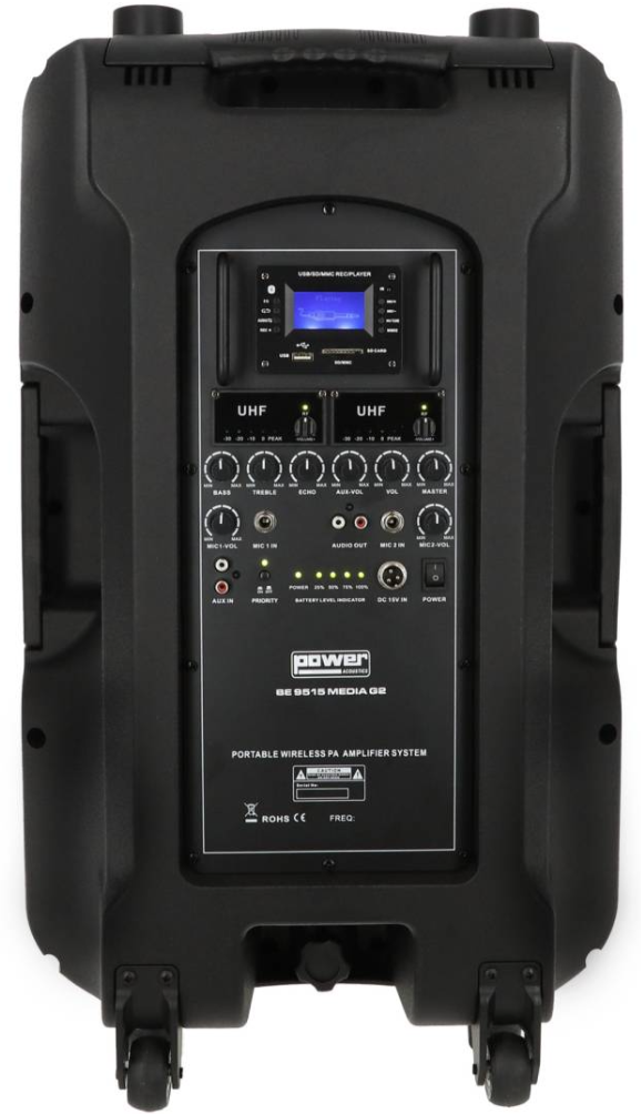 Le Power Acoustics BE 9515 MEDIA G2 est une sono portable performante. Dotée d’un haut-parleur de 15", d’une puissance de 300W et de deux micros UHF multi-fréquences, elle assure une diffusion sonore claire et puissante. Grâce à son lecteur SD/USB/Bluetooth intégré, ses multiples entrées/sorties et son autonomie via batterie 12V/12AH, elle s’adapte parfaitement aux besoins professionnels. Compacte et robuste avec sa caisse ABS, elle est conçue pour des prestations mobiles.