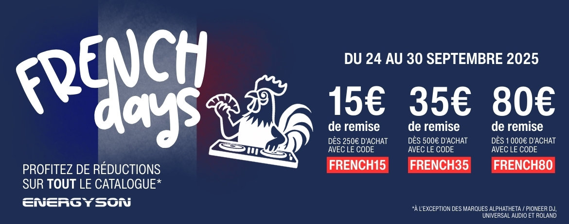 French Days d’automne Energyson : profitez d’offres exceptionnelles dès le 24 septembre 2025 et bénéficiez de codes promotionnels attractifs. -15 € dès 250 € d’achat, -35 € dès 500 € et -80 € dès 1000 €, valables sur toute la boutique (hors marques AlphaTheta/Pioneer DJ, Universal Audio et Roland). Faites vite, l’offre est limitée !