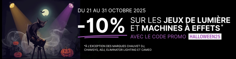 Profitez de la promotion Halloween Energyson du 21 au 31 octobre et bénéficiez de -10% sur tous les jeux de lumières et machines à effets (hors marques Chauvet DJ, ChamSys, ADJ, Eliminator Lighting et Cameo). Utilisez le code promo HALLOWEEN25 lors de votre commande.