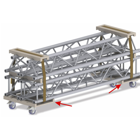 Le BT-TRUSS 29-TROLLEY-BASE est conçu pour être utilisé en combinaison avec les modèles BT-TRUSS 29-TROLLEY-STACK et BT-TRUSS 29-TROLLEY-TOP, permettant ainsi une solution de transport modulaire et flexible. Deux chariots sont nécessaires pour transporter efficacement la structure.
