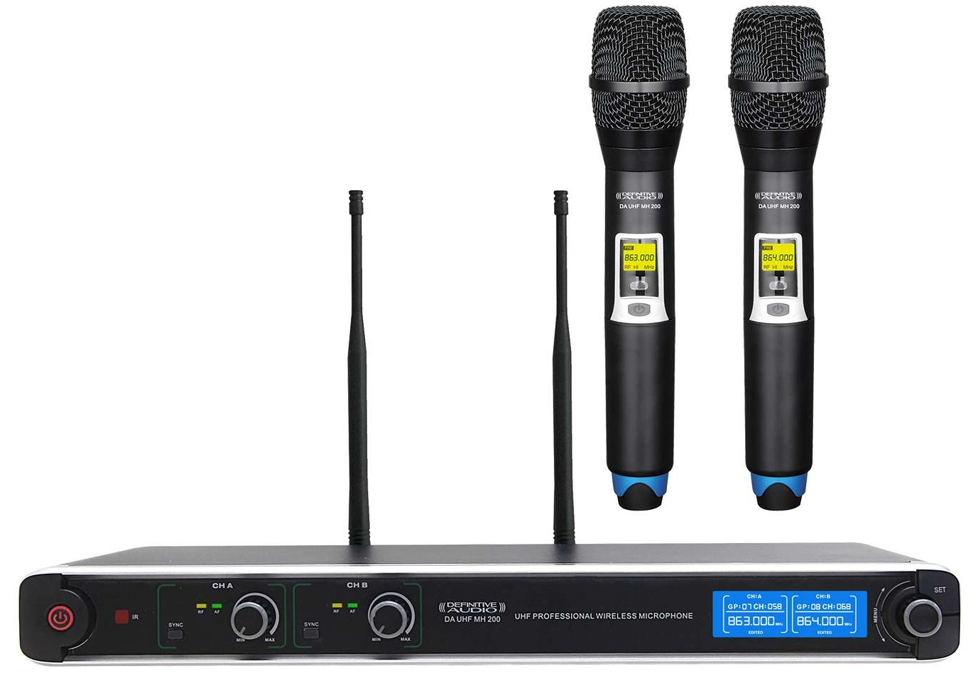 Le Definitive Audio DA UHF MH 200 est un double micro sans fil main UHF performant et polyvalent. Ce système utilise la technologie PLL avec écran LCD, une synchronisation infrarouge ACT, jusqu'à 2000 fréquences commutables, et une portée de 60 mètres. Il offre des sorties XLR indépendantes, une sortie Mix Jack symétrique et une réponse en fréquence étendue de 50 Hz à 18 kHz. Idéal pour les usages professionnels tels que concerts, conférences ou événements, il assure stabilité, clarté et compatibilité avec micros main ou bodypack.