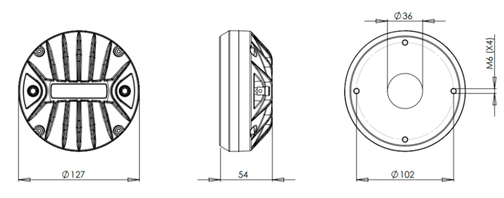 Grâce à ses dimensions compactes (127 mm de diamètre, 54 mm de profondeur), il s’intègre aisément dans des enceintes à géométrie réduite, que ce soit en configuration portable ou fixe. Il constitue une solution idéale pour les systèmes nécessitant un moteur puissant sans sacrifier l’espace.