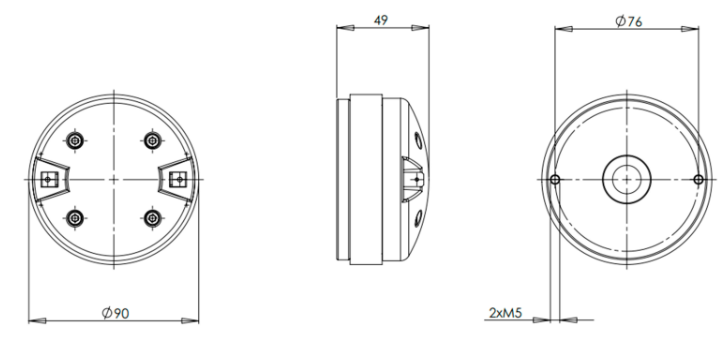 Le DE12TC 8 Ohm s’intègre facilement dans des systèmes audio professionnels grâce à ses fixations normalisées (2 trous M5 à 180° sur 76 mm). Sa profondeur de 49 mm et son diamètre total de 90 mm permettent de l’adapter dans des enceintes compactes ou des retours de scène discrets. Il répond aux contraintes de poids et de place sans compromettre la qualité audio.