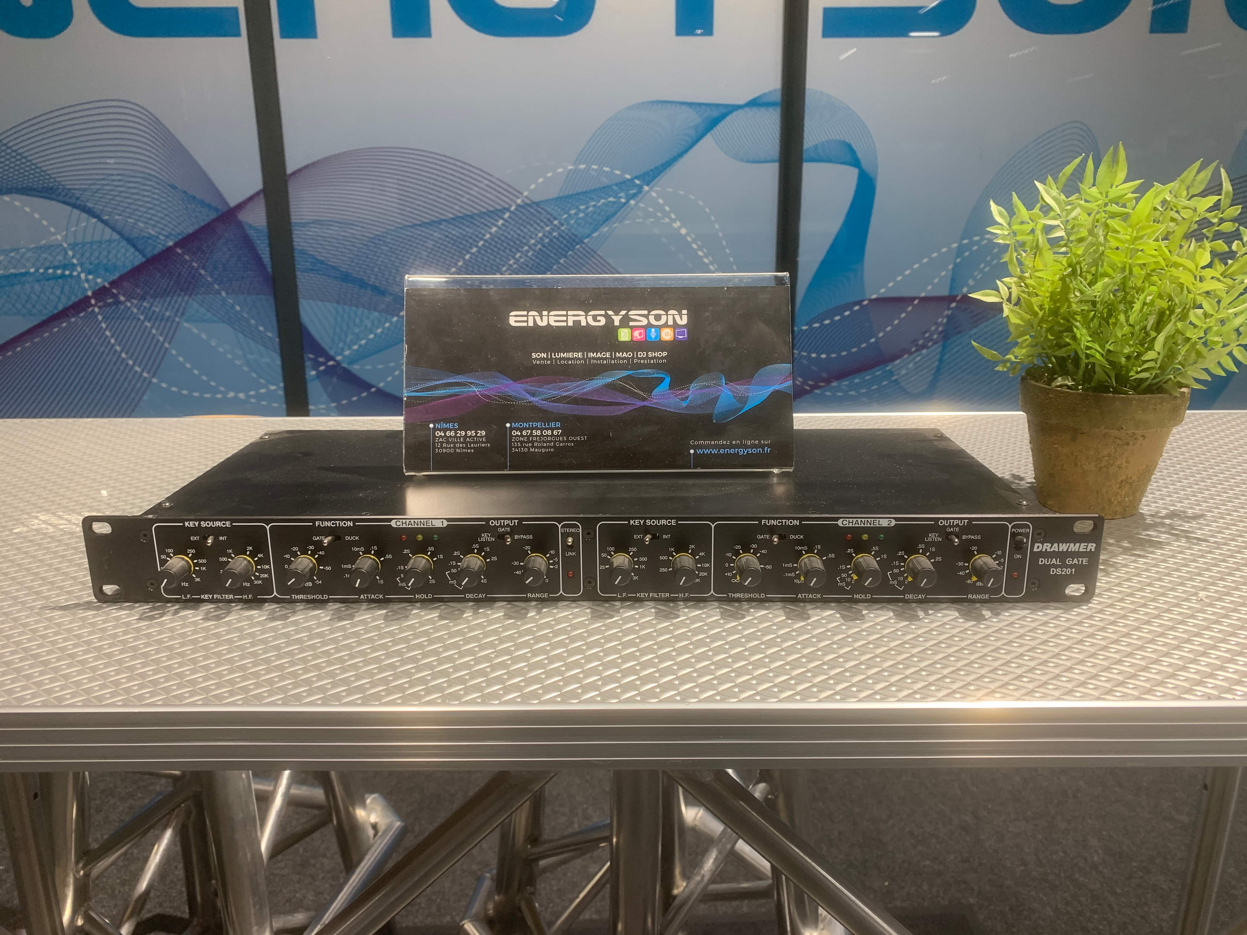 Le DS201 est noise gate à deux canaux qui intègre un certain nombre de caractéristiques conçues par Drawmer, qui sont inestimables pour l'ingénieur du son et que l'on ne trouve pas sur les portes de bruit conventionnelles. Il intègre un filtre passe-haut et un filtre passe-bas, qui agissent sur le circuit de keying de la chaîne latérale. En réglant le commutateur de sortie sur key listen, l'utilisateur peut entendre l'action des filtres et les ajuster pour rejeter les hautes fréquences provenant des hi-hats. Cela permet maintenant au gate de ne s'ouvrir que sur les basses fréquences présentes dans la snare.