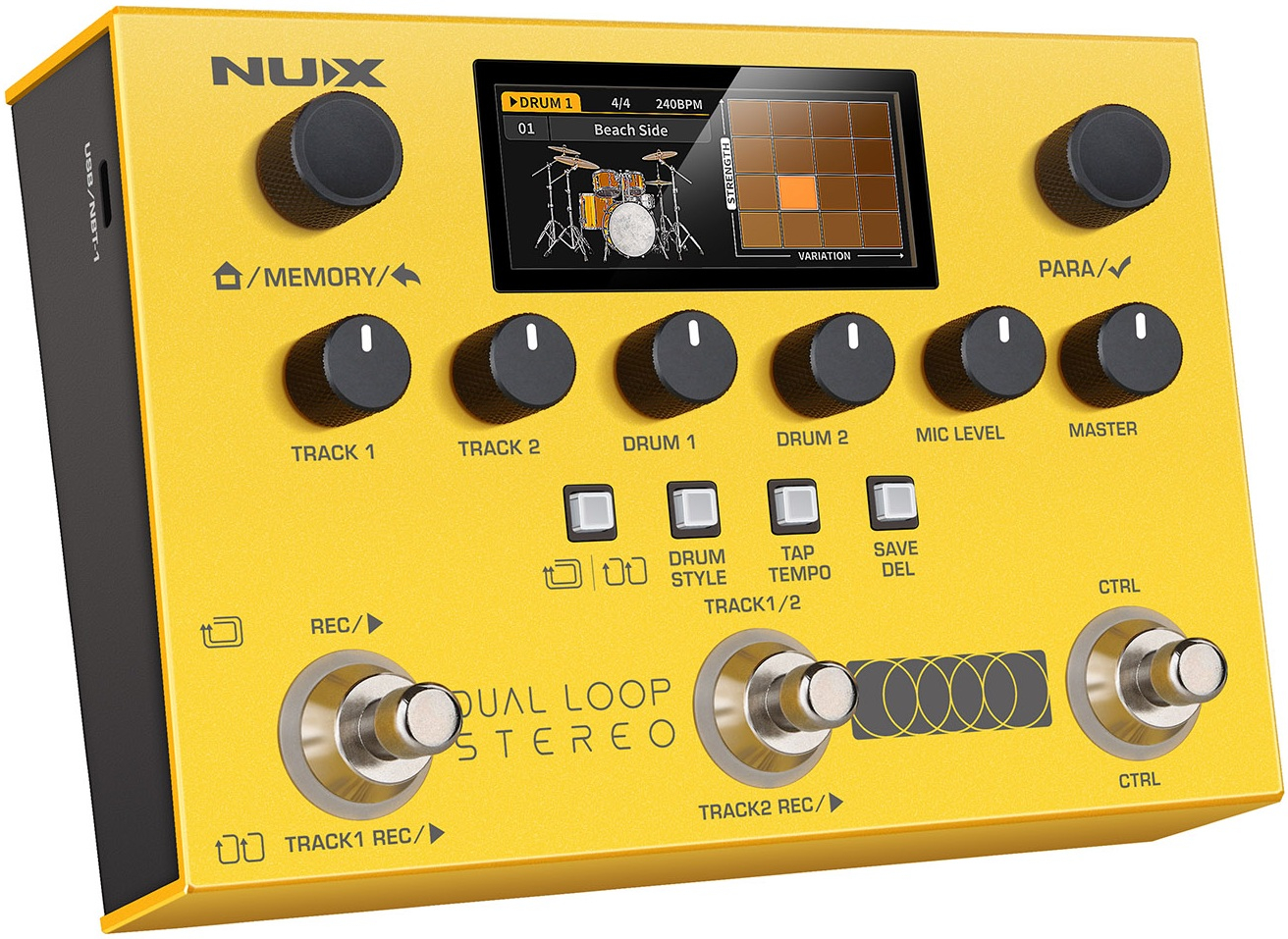 L’écran couleur haute définition du NUX Dual Loop Stereo offre une lisibilité optimale, même sur scène. Il affiche clairement l’état de chaque boucle, les effets actifs, les niveaux et les rythmes. Les potentiomètres dédiés permettent de contrôler individuellement chaque piste, la section batterie, le micro et le volume master.