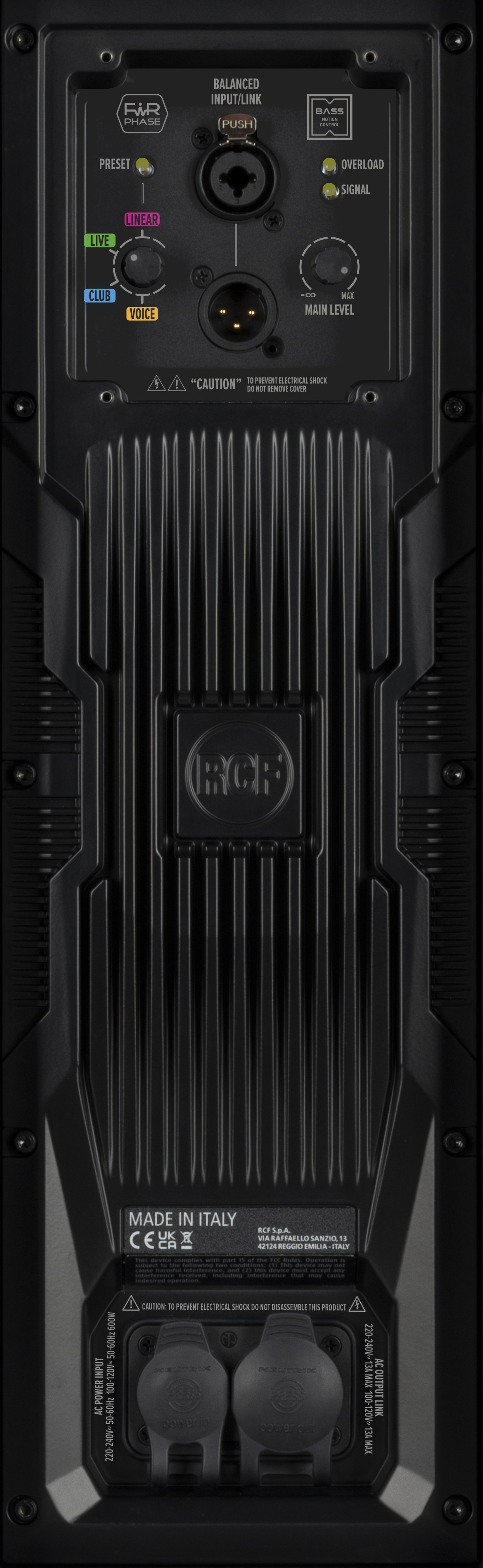 L’amplificateur Class-D de 3500 W délivre une puissance répartie sur deux canaux : 1500 W pour les hautes fréquences et 2000 W pour les basses. Ce système bi-amplifié permet une réponse dynamique élevée tout en optimisant la consommation et le refroidissement par convection. Le traitement DSP intégré comprend un limiteur Soft Limiter et plusieurs préréglages (LINEAR, LIVE, CLUB, VOICE).