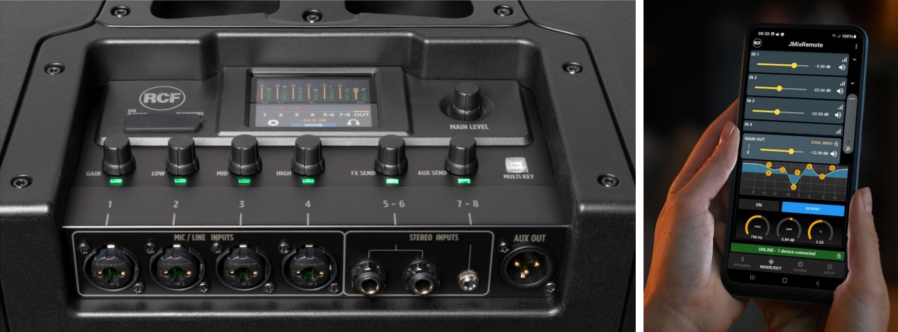 Les entrées micro avec alimentation fantôme, filtres coupe-bas, compresseurs RCF, égalisations 3 bandes, et effets intégrés permettent une gestion audio complète. Il est ainsi possible de mixer micros, instruments et sources stéréo sans matériel externe.