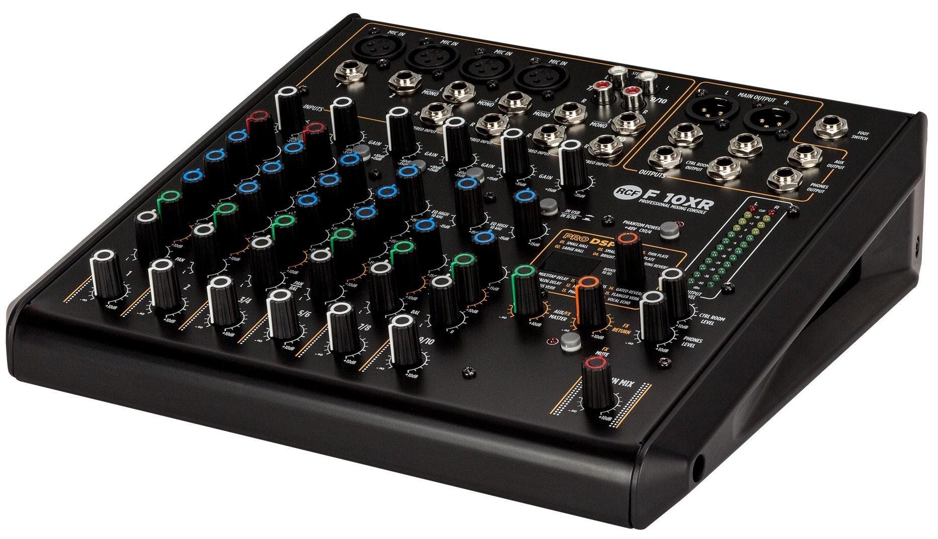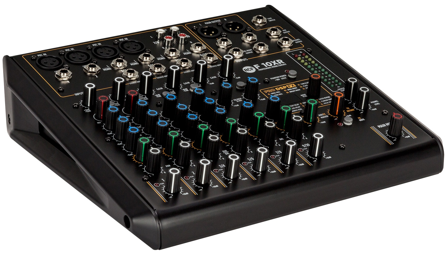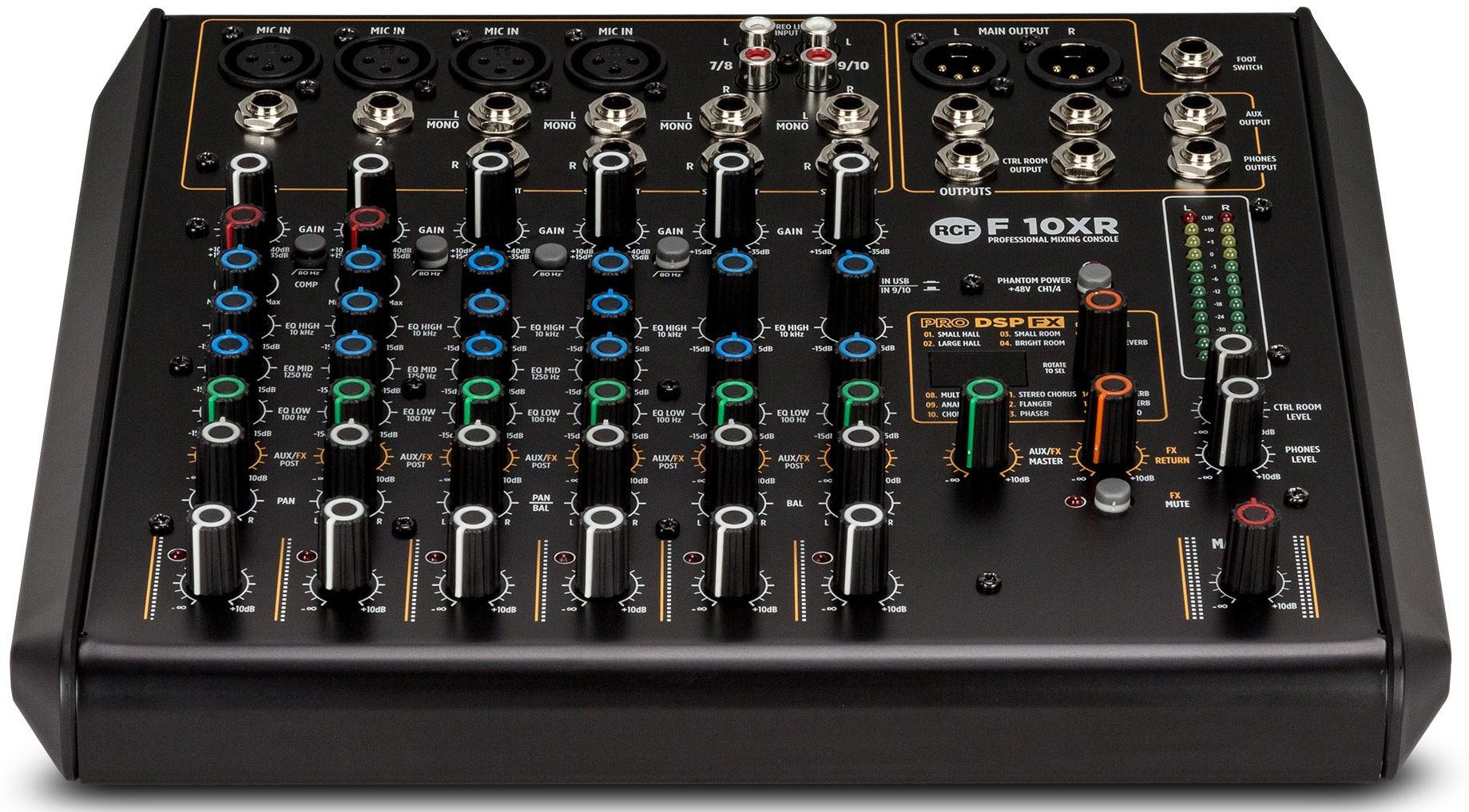 La nouvelle F 10XR, table de mixage analogique de la Série F de RCF, offre un son de haute qualité avec 10 canaux. Avec son interface esthétique et ses connecteurs robustes, la Série F vous permet de mixer aisément votre musique avec un minimum de compétences techniques. Logé dans un châssis métallique robuste, chaque table de mixage est entièrement symétrique avec un faible bruit de l'entrée à la sortie, des compresseurs contrôlés indépendamment pour limiter les crêtes de signal, un égaliseur moderne et le DSP PRO FX : 16 effets professionnels. Elle intègre une interface audio USB permettant l’enregistrement stéréo sur une station de travail audionumérique et la lecture sur 2 canaux.