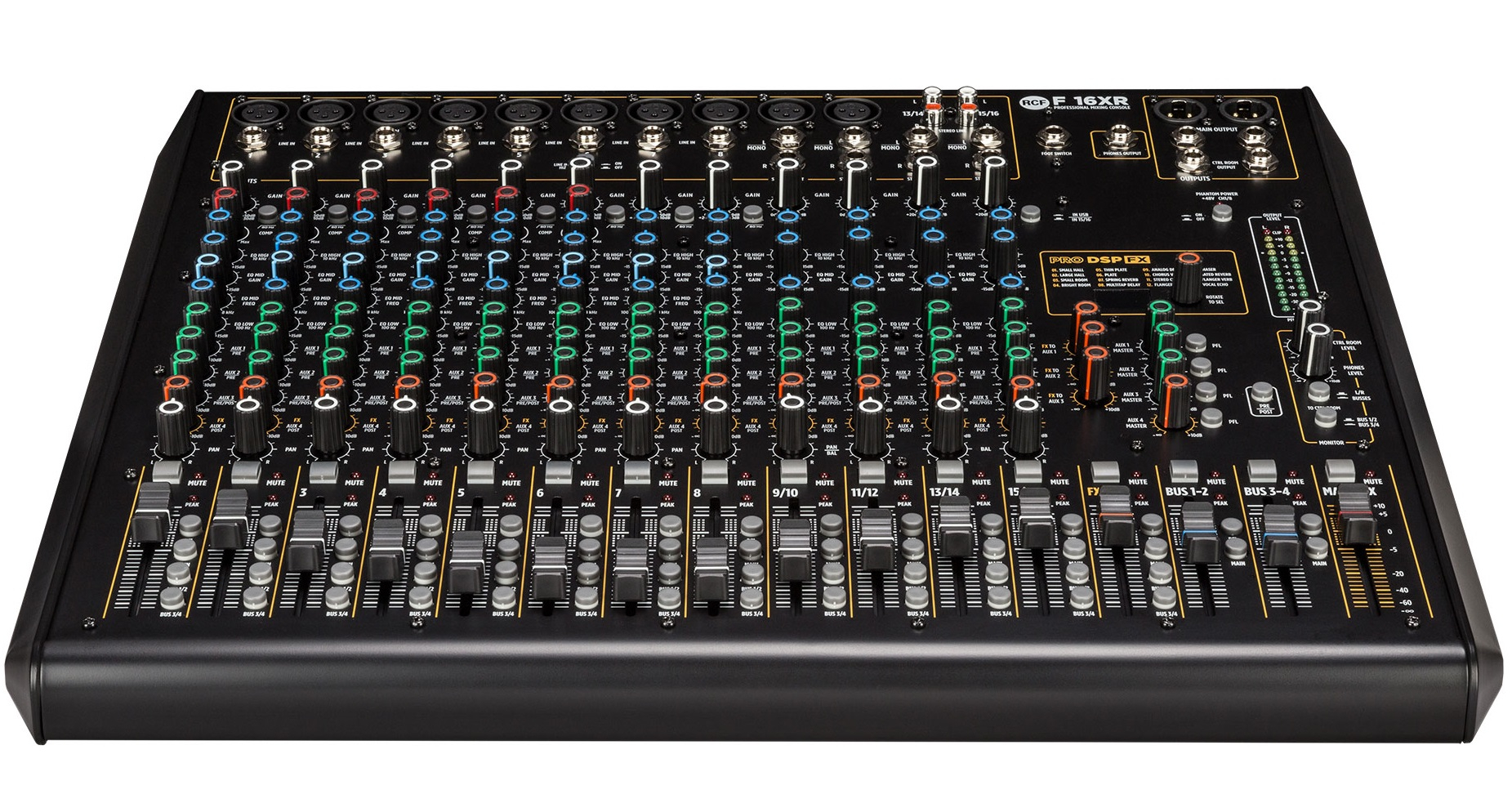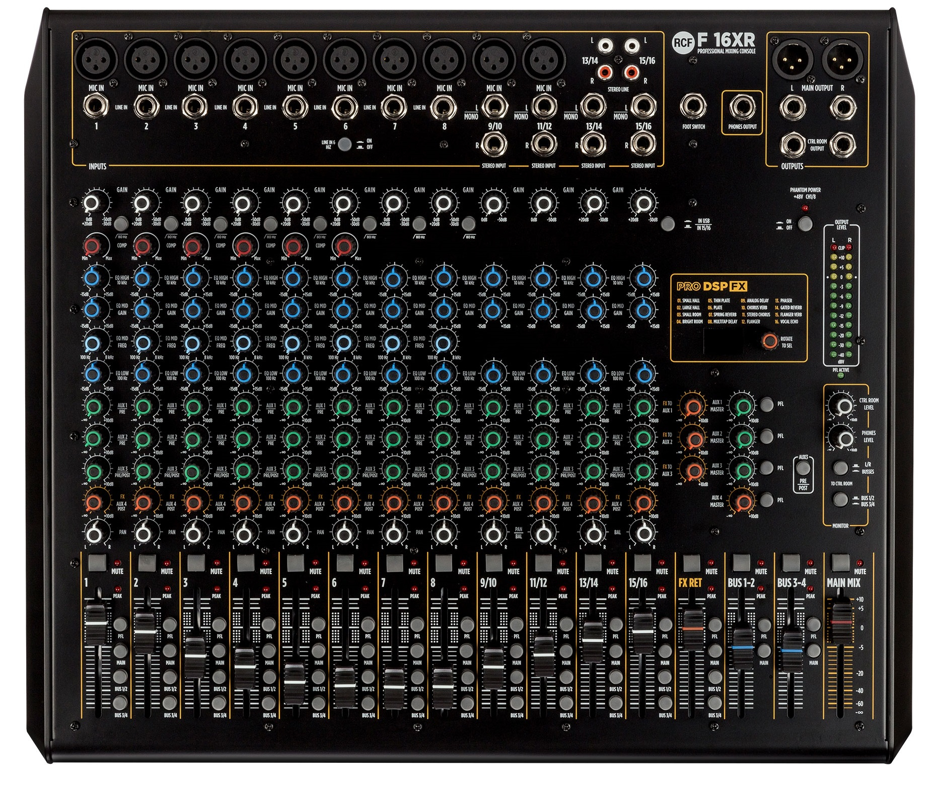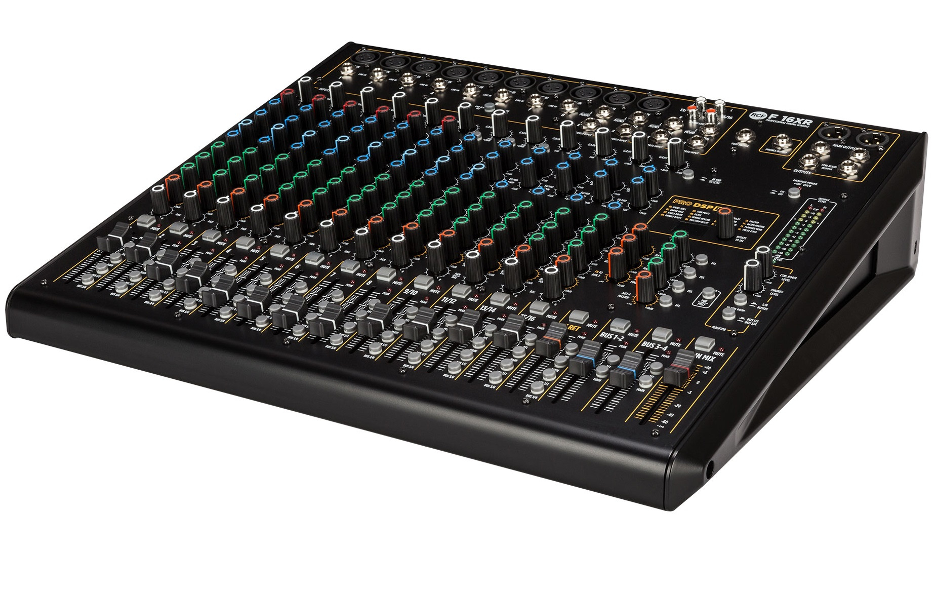La nouvelle F 16XR, table de mixage analogique de la Série F de RCF, offre un son de haute qualité avec 16 canaux. Avec son interface esthétique et ses connecteurs robustes, la Série F vous permet de mixer aisément votre musique avec un minimum de compétences techniques. Logé dans un châssis métallique robuste, chaque table de mixage est entièrement symétrique avec un faible bruit de l'entrée à la sortie, des compresseurs contrôlés indépendamment pour limiter les crêtes de signal, un égaliseur moderne et le DSP PRO FX : 16 effets professionnels. Elle intègre une interface audio USB permettant l’enregistrement stéréo sur une station de travail audionumérique et la lecture sur 2 canaux.