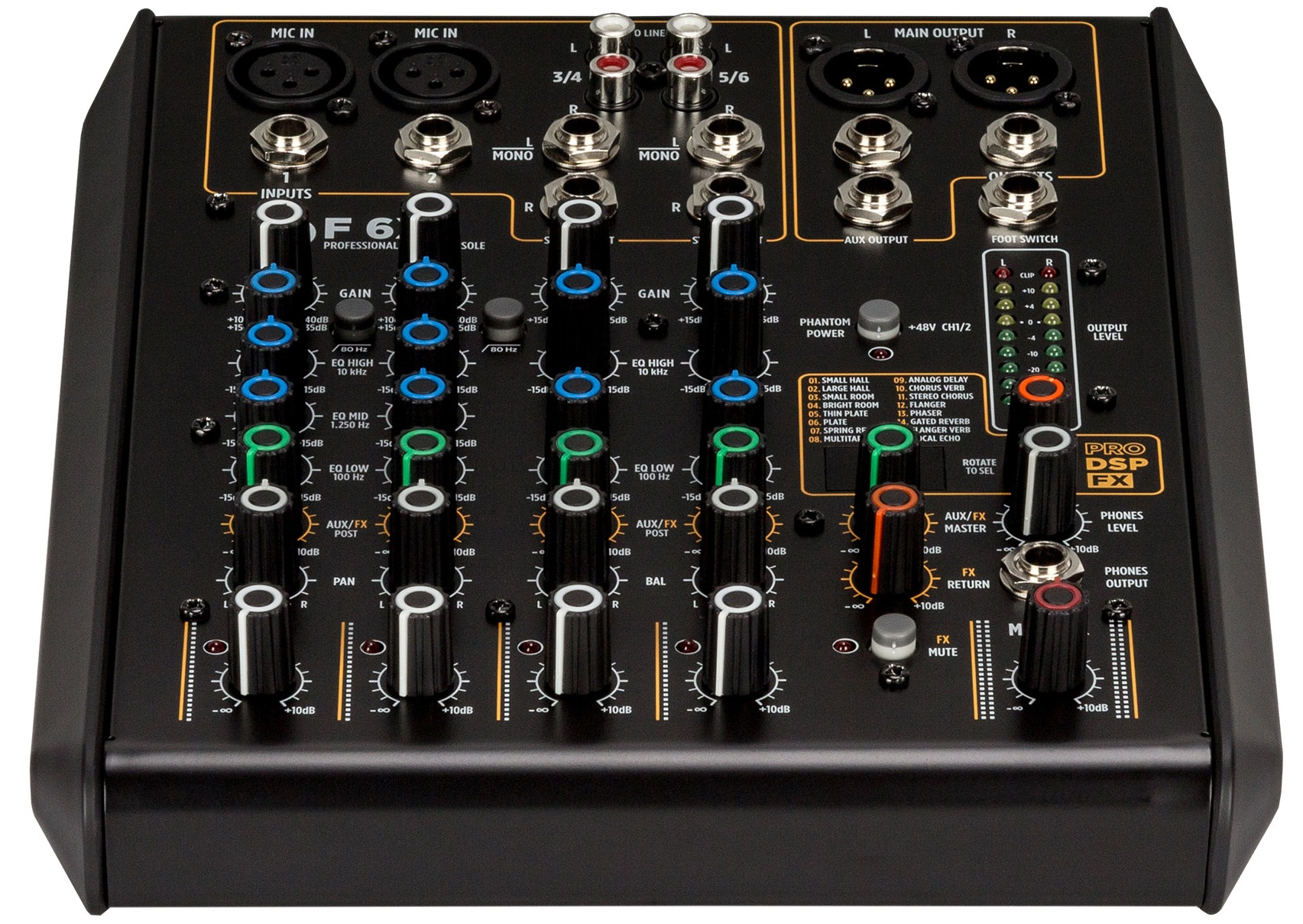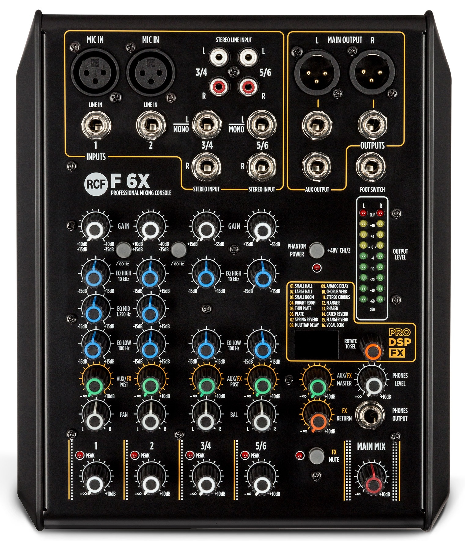 La nouvelle F 6X, table de mixage analogique de la Série F de RCF, offre un son de haute qualité avec 6 canaux. Avec son interface esthétique et ses connecteurs robustes, la Série F vous permet de mixer aisément votre musique avec un minimum de compétences techniques. Logé dans un châssis métallique robuste, chaque table de mixage est entièrement symétrique avec un faible bruit de l'entrée à la sortie, des compresseurs contrôlés indépendamment pour limiter les crêtes de signal, un égaliseur moderne et le DSP PRO FX : 16 effets professionnels.