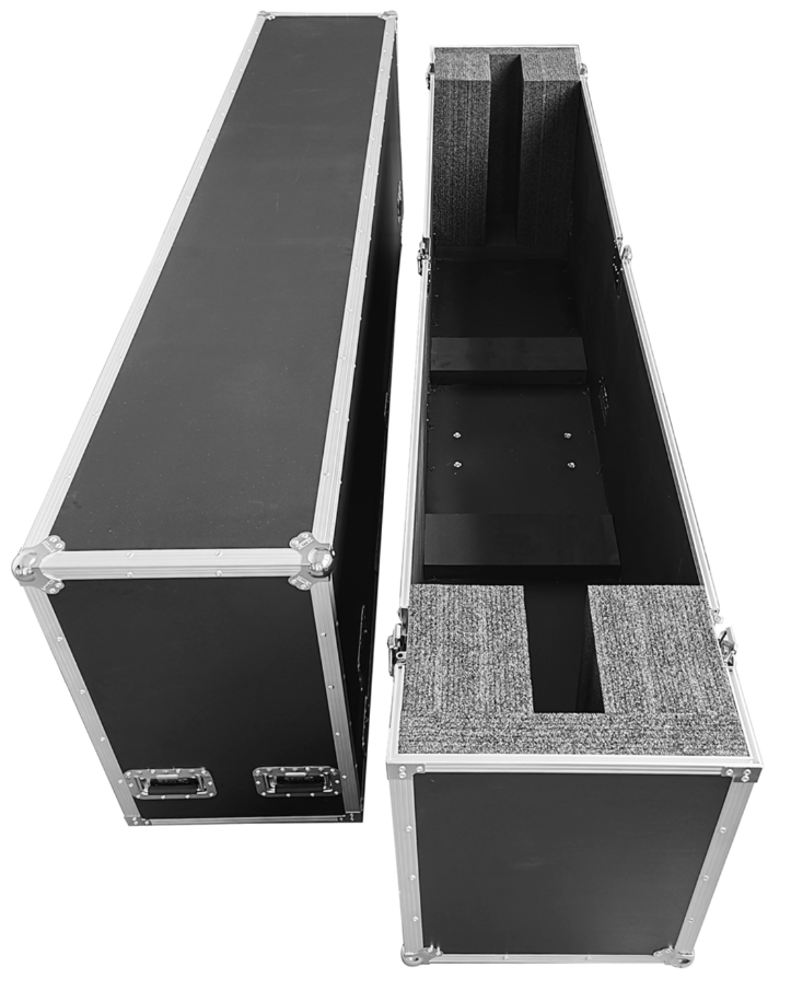 Les dimensions extérieures du flight case sont de 2370 mm de long, 1400 mm de haut et 460 mm de profondeur, avec une capacité maximale écran de 2240 mm de largeur.