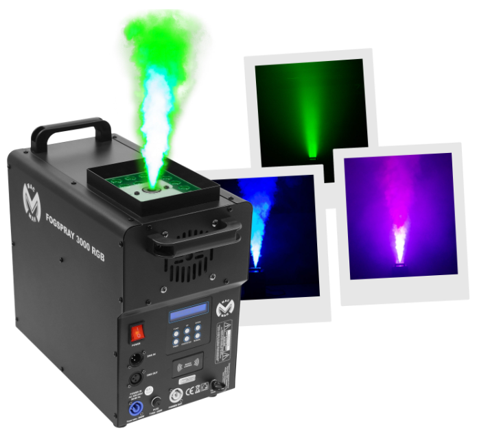 La Mac Mah Fog Spray 3000 RGB se distingue par son puissant effet geyser combinant fumée blanche et éclairage LED RVB. Grâce à ses 24 LED de 3 watts, elle colore le jet de fumée directement à sa base, créant un rendu volcanique spectaculaire. Cette intégration lumineuse transforme chaque projection en effet visuel dynamique et immersif, idéal pour renforcer l’impact visuel d’une scène ou d’un événement festif.
