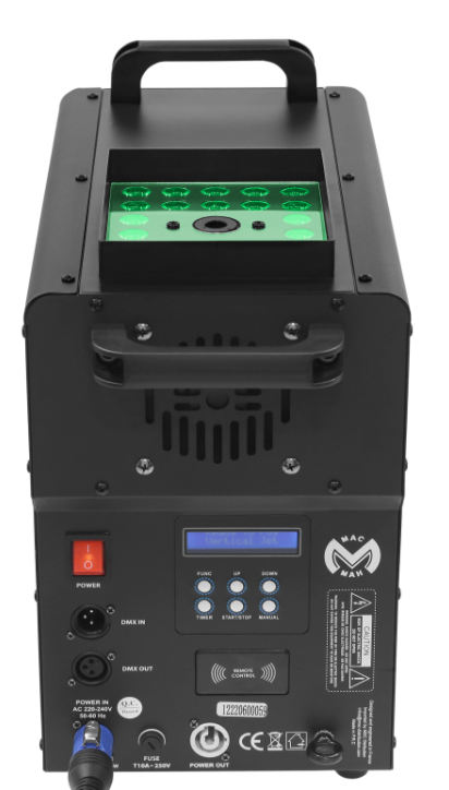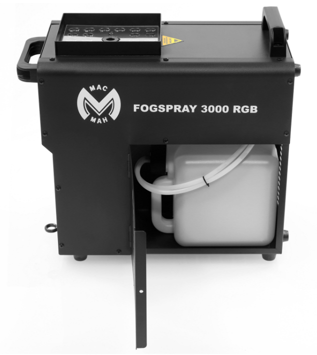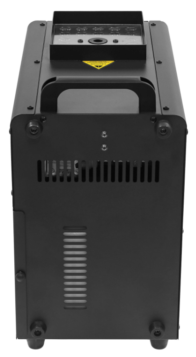 Elle utilise une résistance de 3000 W pour chauffer un liquide à fumée contenu dans un bidon de 2,5 L. En projection verticale ou horizontale, la fumée est expulsée jusqu’à 8 m. Le tout est synchronisé avec des LED RVB pour un rendu coloré. Elle est contrôlable via DMX ou télécommande.