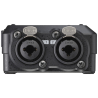Sur le TASCAM FR-AV2, les deux entrées combinées XLR/jack 6,3 mm sont pensées pour les microphones et sources ligne de niveau professionnel, avec possibilité d’alimentation fantôme 24 V ou 48 V. L’entrée mini-jack 3,5 mm stéréo sert plutôt à récupérer un signal d’une caméra, d’un récepteur de micro sans fil ou d’un petit micro, avec une tension d’alimentation sélectionnable 2,5 V ou 5 V. En pratique, les XLR seront privilégiées pour la prise principale, tandis que le mini-jack peut servir de piste d’appoint, de retour caméra ou de source légère. Ce choix améliore la compatibilité sans multiplier les adaptateurs sur plateau.