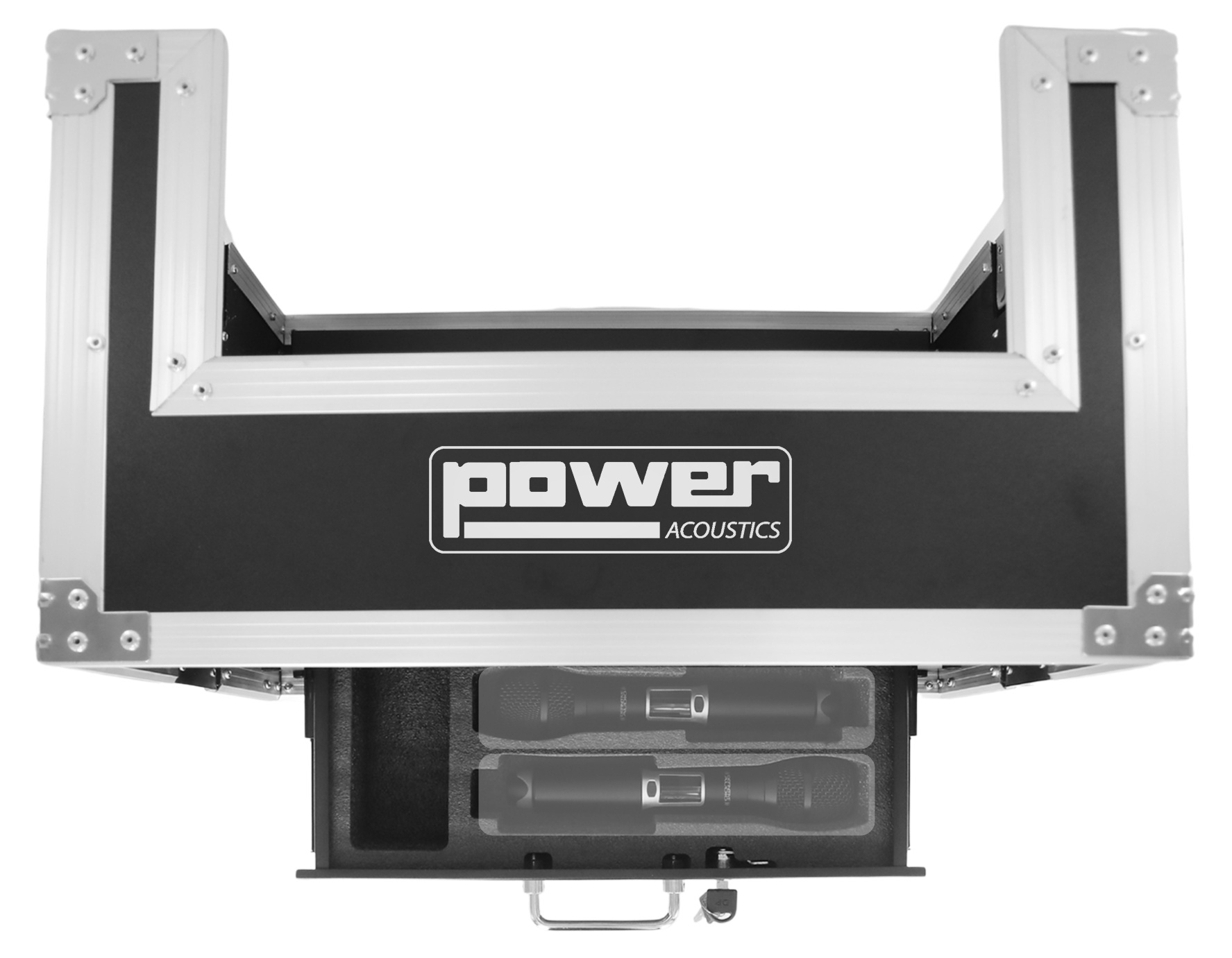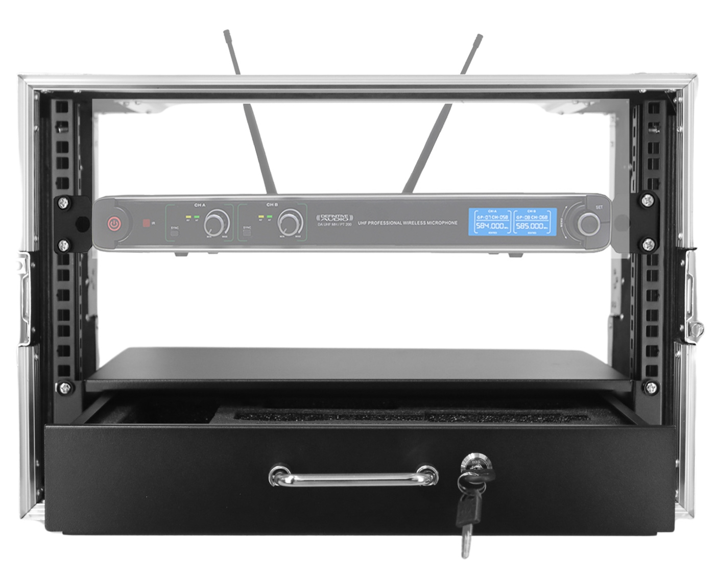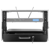 Le tiroir de rangement intégré au bas du rack apporte un vrai gain de confort pour les accessoires micro sans fil. Vous pouvez y ranger des micros, des antennes, des bodypacks et de petits consommables, tout en évitant de multiplier les pochettes. Le bouton-poussoir simplifie l’ouverture, et l’ensemble reste compact avec une finition noire et des bordures aluminium adaptées aux environnements de tournée.