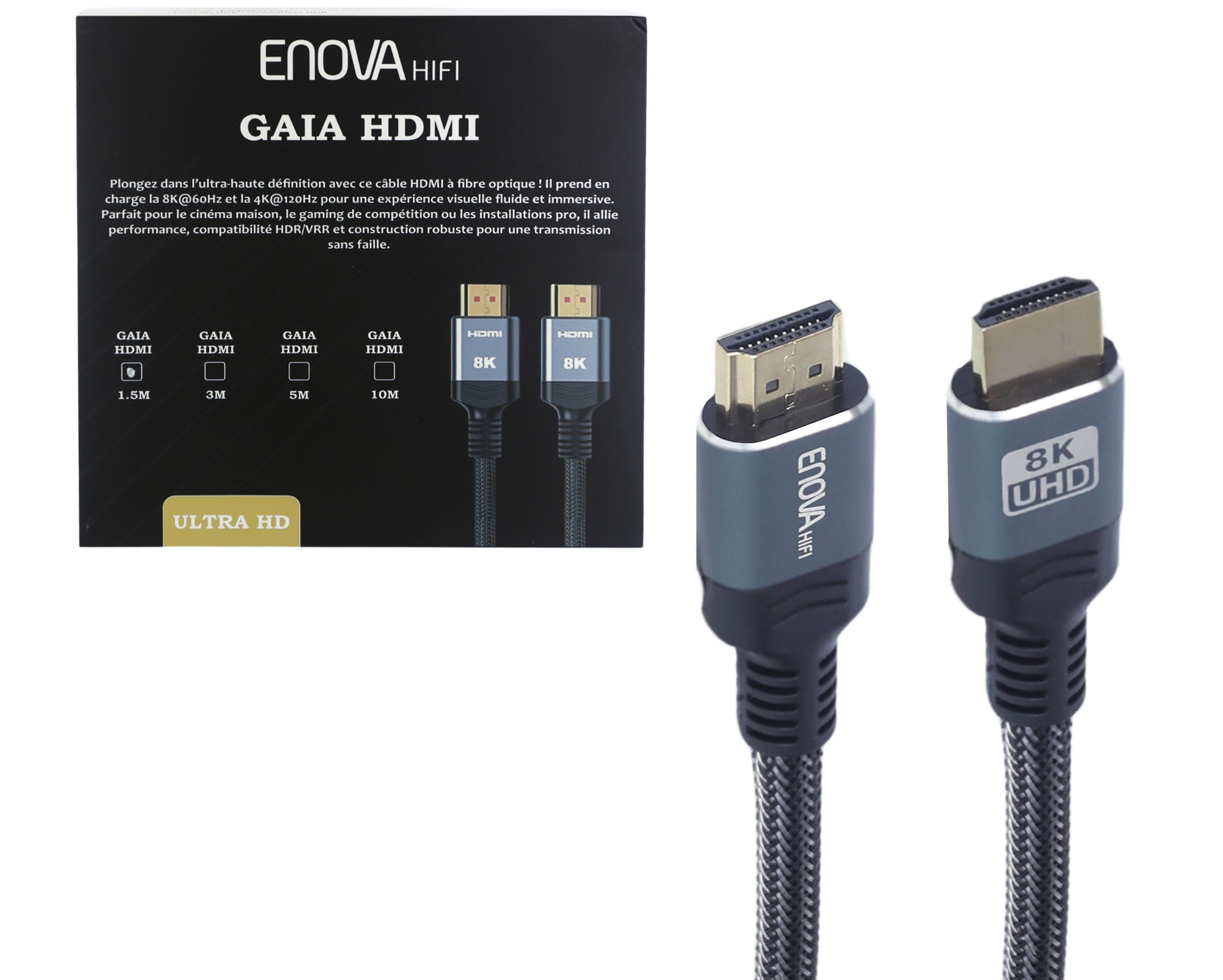 Le câble HDMI Enova Hifi GAIA HDMI 1.5M est conçu pour relier une source et un écran avec les exigences actuelles du home cinéma et du gaming. Sa norme HDMI 2.1 Ultra High Speed permet d’exploiter des contenus 8K à 60 Hz ou 4K à 120 Hz, selon la compatibilité des appareils. Ce positionnement le rend pertinent pour un téléviseur Ultra HD, un vidéoprojecteur, une console PS5 ou Xbox Series, ainsi qu’un PC gaming.