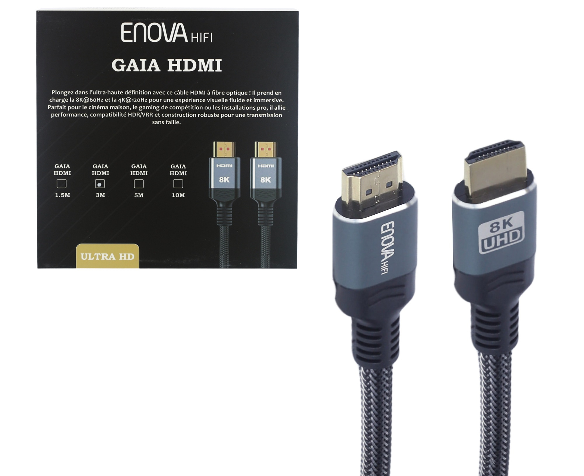 Le Enova Hifi GAIA HDMI 3M est un câble HDMI 2.1 Ultra High Speed pensé pour répondre aux contraintes des installations home cinéma haut de gamme, du gaming nouvelle génération et des environnements professionnels. Sa longueur de 3 m aide à relier proprement un téléviseur, un vidéoprojecteur, une console ou un ordinateur, tout en conservant une liaison stable. Grâce à un débit pouvant atteindre 48 Gbps, la transmission reste fiable sur des contenus exigeants, sans latence, sans saccades et sans perte de qualité perceptible.