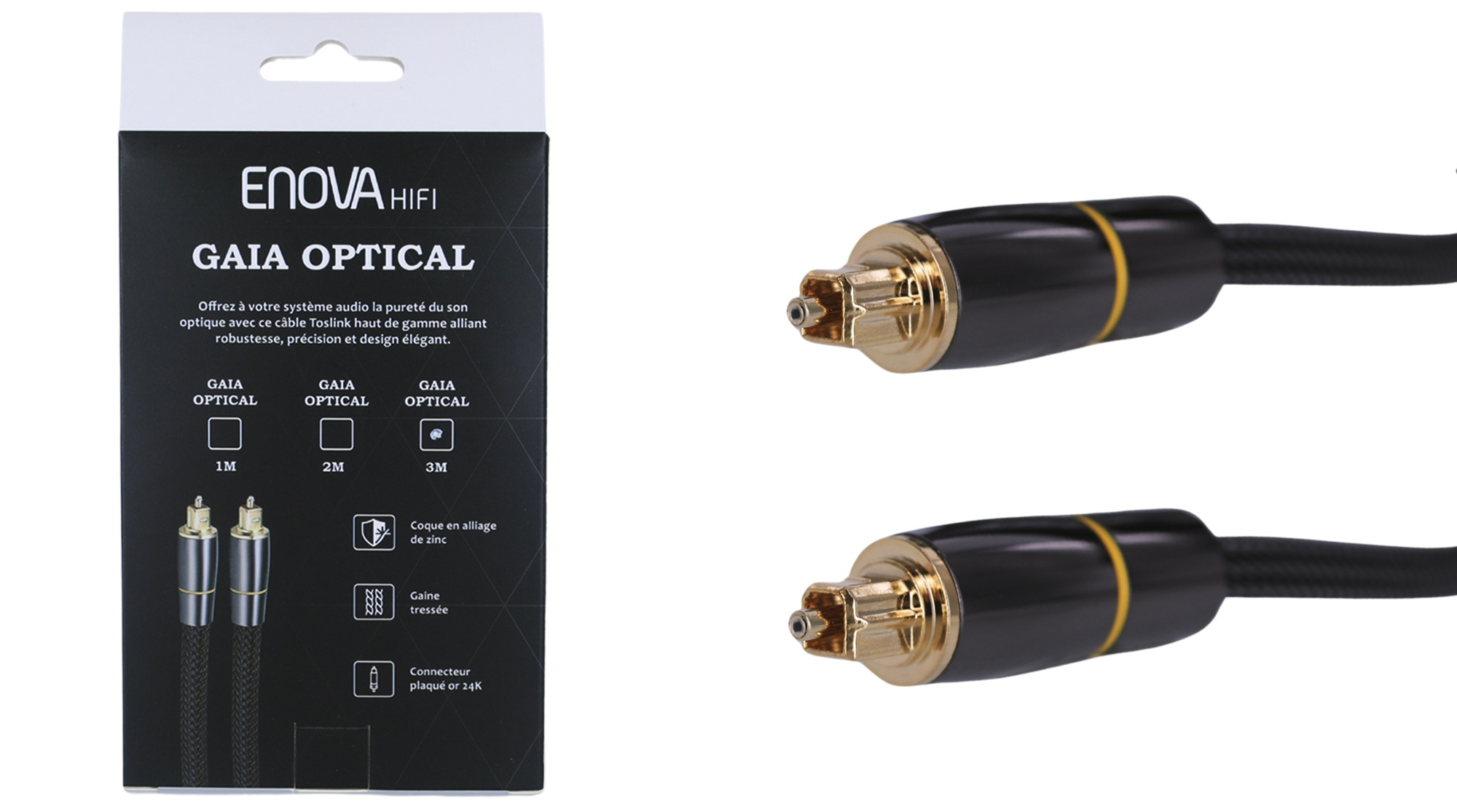 Oui, le Enova Hifi GAIA OPTICAL (3M) est un câble audio numérique optique Toslink avec connectique Toslink mâle / Toslink mâle, prévu pour les liaisons S/PDIF optiques. Il convient pour relier une tv, un lecteur blu-ray ou une console à l’entrée optique d’un amplificateur home cinéma, à condition que l’appareil dispose bien d’un port Toslink. La longueur 3 m aide à positionner l’ampli dans un meuble ou un rack sans contrainte. Pour une installation propre, conservez un chemin de câble sans pincement et évitez les pliages serrés afin de préserver la fibre optique.