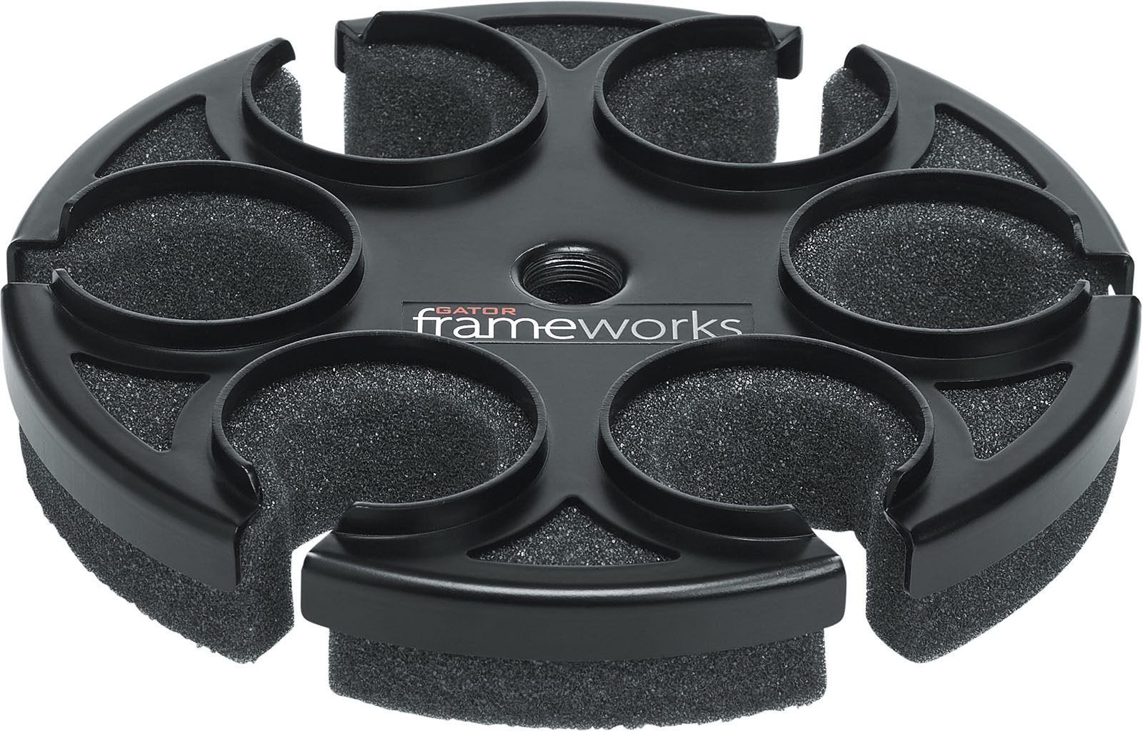 Le plateau multi-micros de Gator Frameworks est conçu pour s’adapter facilement à la majorité des pieds de microphone standards. Il suffit de le fixer à l’aide de la vis centrale prévue à cet effet, généralement compatible avec les filetages habituels du secteur audio.